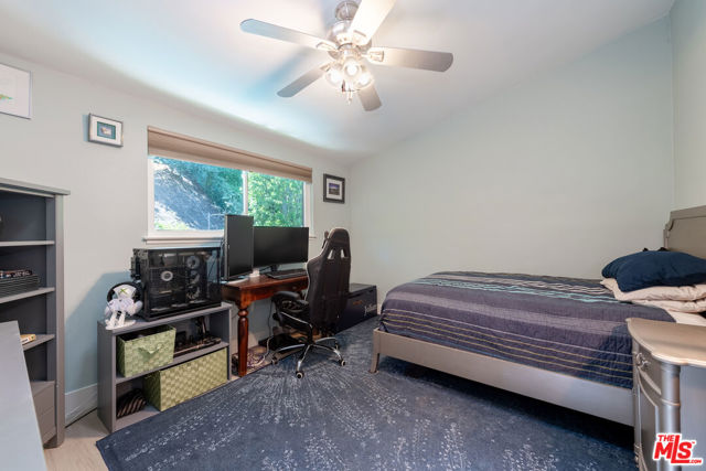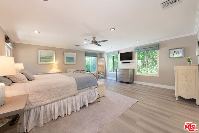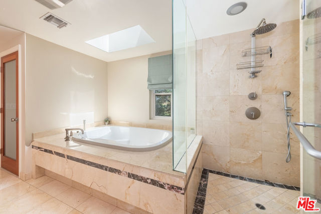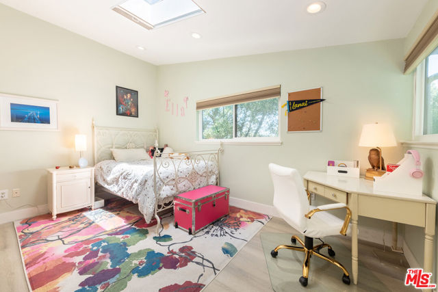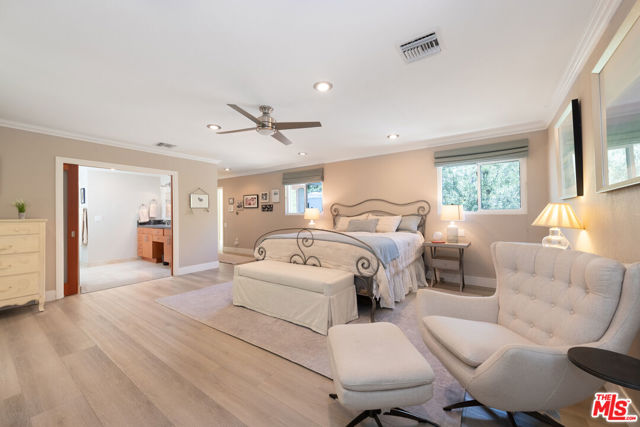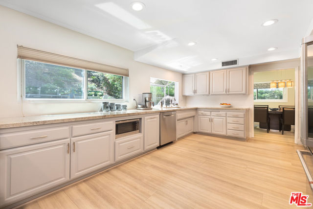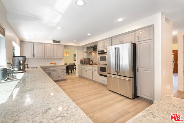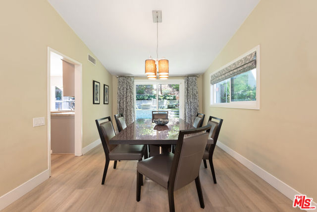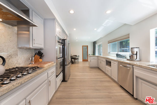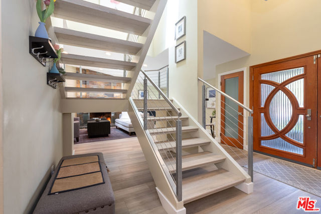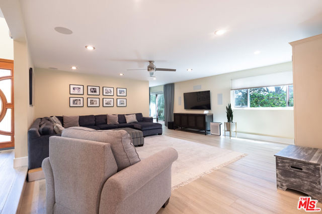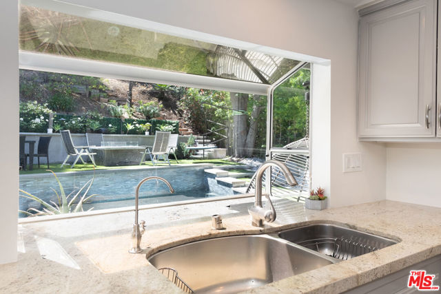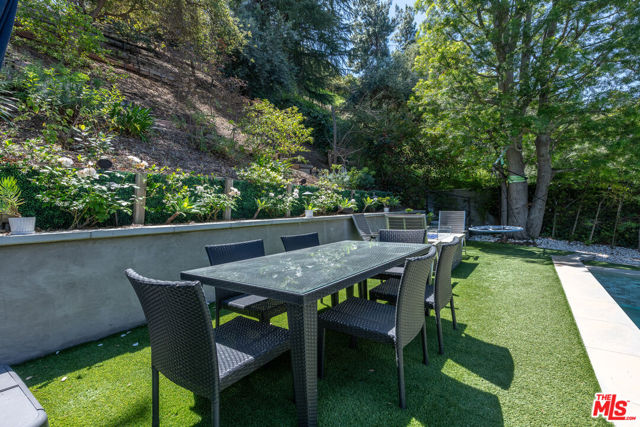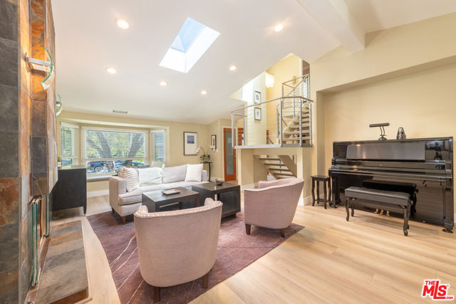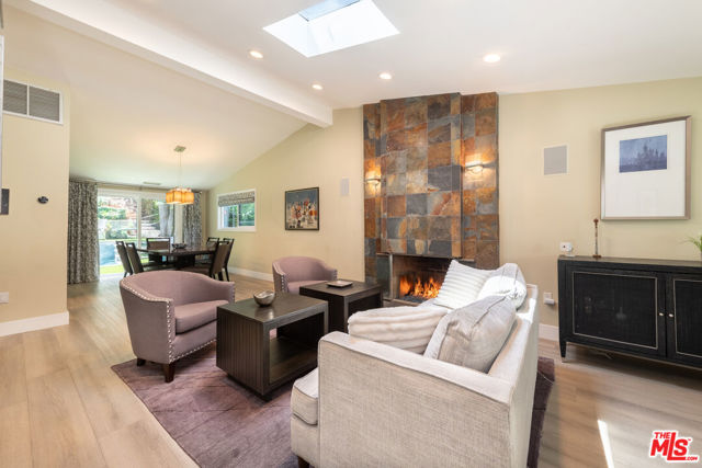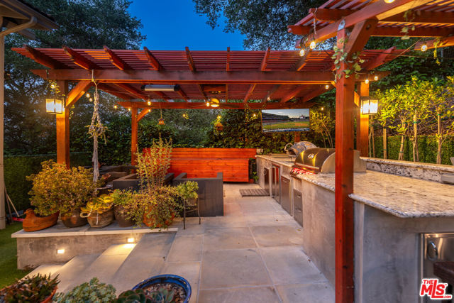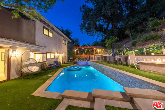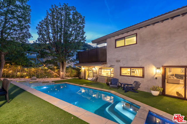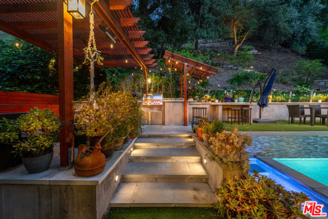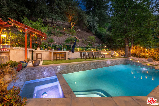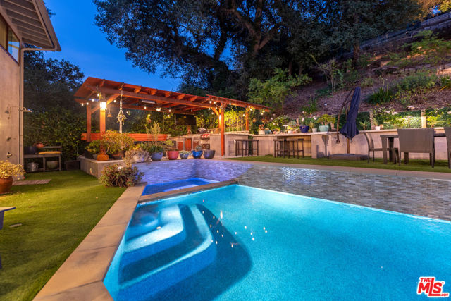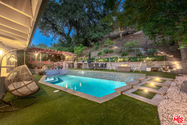 Experience the tranquil "Santa Monica Canyon" lifestyle in the heart of the Encino Hills with this stunningly remodeled and expanded contemporary home, perfectly positioned at the end of a quiet cul-de-sac just minutes from Mulholland Drive. A striking ridge glass double door entry reveals a dramatic, skylit living room anchored by a vaulted ceiling and a slate faced fireplace, while natural toned vinyl floors lead you into an expansive gourmet kitchen featuring granite counters, stainless steel appliances, and a sun drenched breakfast room with sliding French doors. The main level also offers a cozy family/media room with a nearby guest bedroom or home office, while the upstairs serves as a private retreat with two additional bedrooms and a spacious master suite boasting serene treetop views and a light infused marble bath complete with a spa tub, rain shower, and custom walk in closet. Outside, the lush grounds include a tranquil side yard and a backyard oasis with a slate tiled pergola shaded outdoor dining pavilion and kitchen/BBQ center overlooking a refreshing plunge pool and spa. For ultimate relaxation, a meandering hillside path ascends to a meditation pergola, offering breathtaking views of the mountains and valley lights, all while providing excellent Westside access and placement within the sought after Lanai Road Charter Elementary School district.