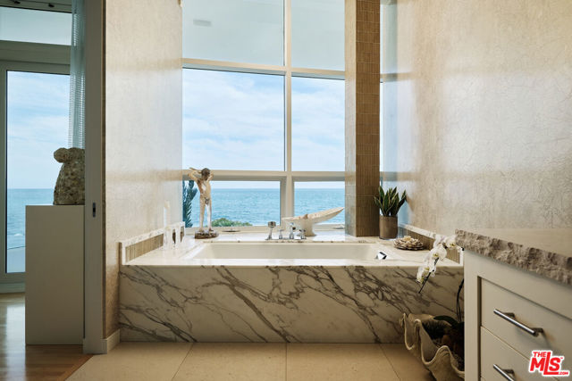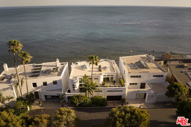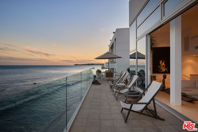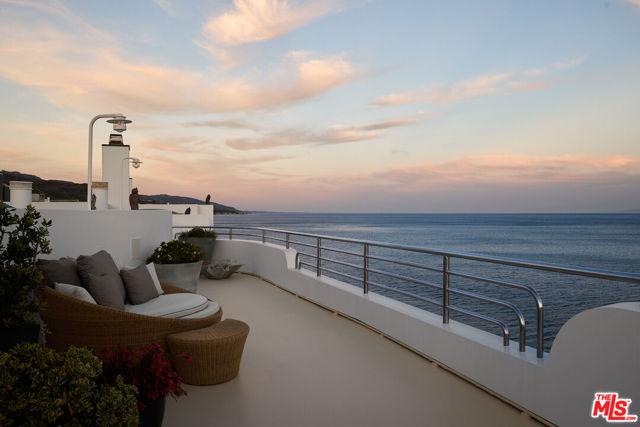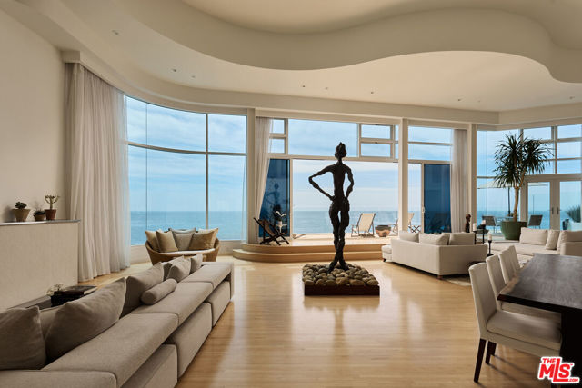 A sculptural presence along the sands of Malibu Cove Colony, this beachfront residence is conceived as a dialogue between light, form, and the Pacific horizon. Walls of glass and soft, organic curves draw every space toward 60 feet of ocean frontage, with sweeping views from Point Dume to Palos Verdes.Interiors unfold with gallery like clarity, where soaring ceilings and skylights bathe open living, dining, and kitchen areas in natural light. A refined fireplace anchors the space, while glass doors extend to a full width balcony poised for sunset.Above, a loft and rooftop retreat offer quiet elevation. Below, three ensuite bedrooms provide privacy, including a serene primary suite with fireplace, spa inspired bath, and terrace overlooking the sea. Set within a guard gated enclave, the home stands as a modern expression of coastal living, where architecture and ocean exist in effortless harmony.