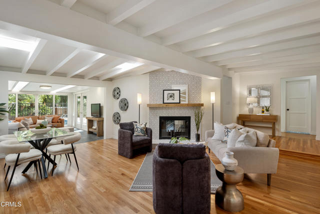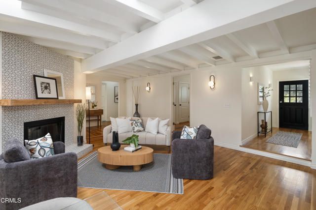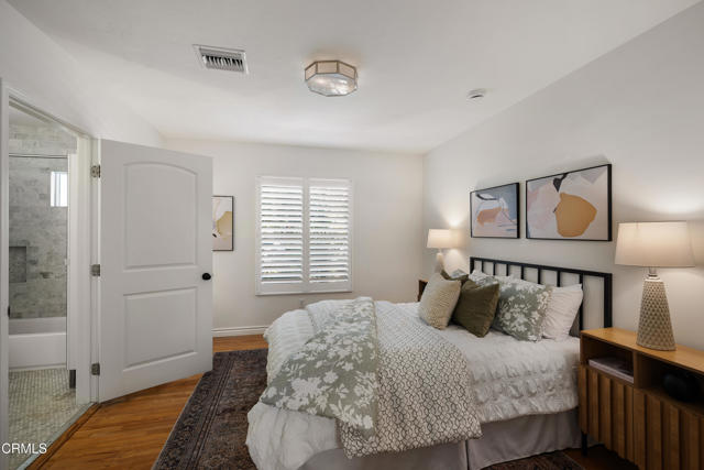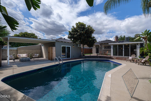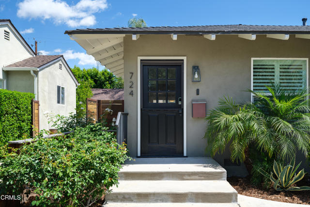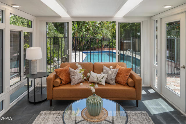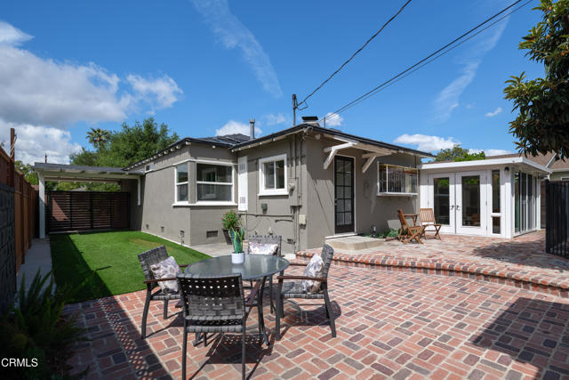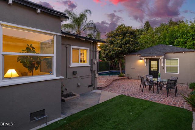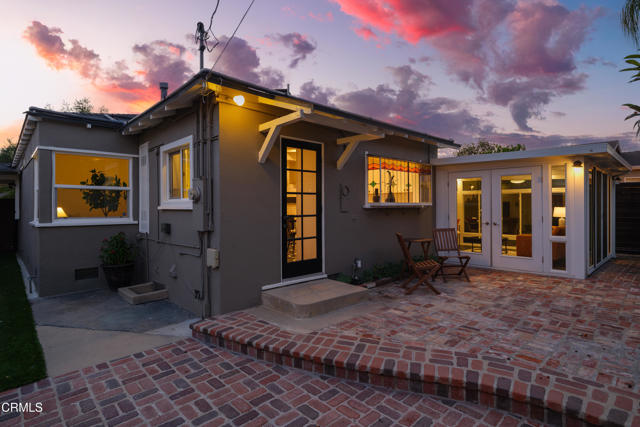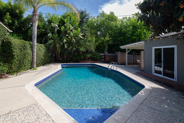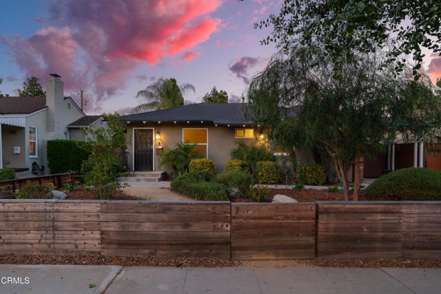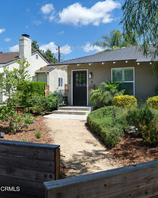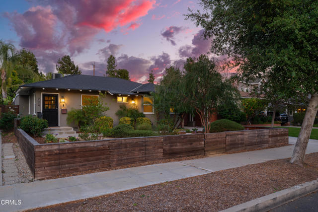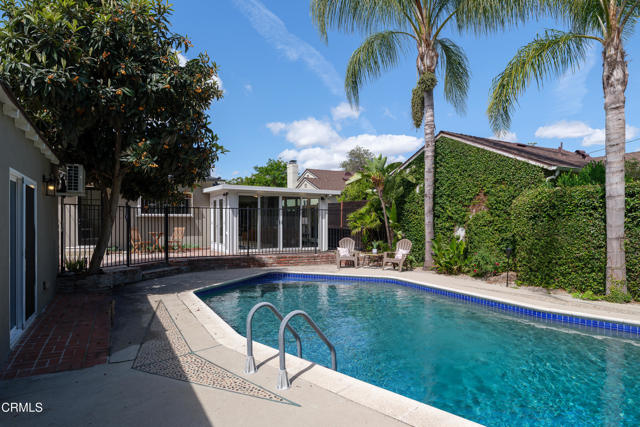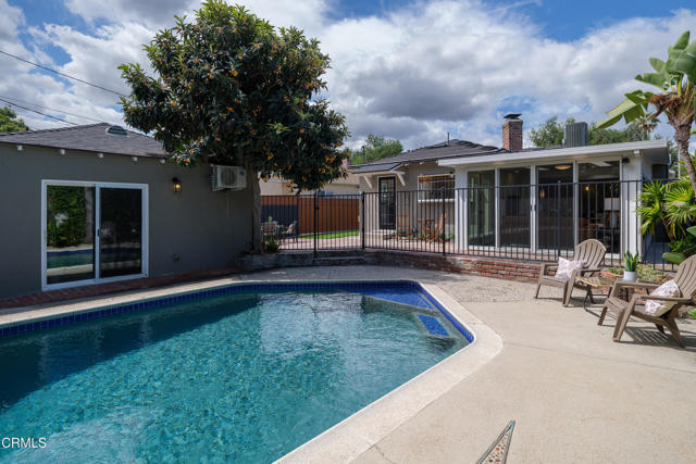 Set on a charming tree-lined street in the heart of Burbank, just moments from the studios, local parks, the Chandler bike path, and the shops and dining along Magnolia Boulevard, this beautifully updated 3-bedroom home offers style, comfort, and versatile living. Entering through a welcoming Dutch door, newly refinished hardwood floors lead into an expansive living space that seamlessly flows into a sun-filled, glass-enclosed family room with skylights. A custom-tiled fireplace with a stylish hearth anchors the main living area, creating a warm and inviting atmosphere. The updated kitchen is thoughtfully designed with tile flooring, stone countertops, a subway tile backsplash, and a stainless steel appliance suite. A standout feature is the custom copper hood above the five-burner range, complemented by abundant cabinetry and recessed lighting. A convenient laundry area with side-by-side front-loading washer and dryer is also located within the kitchen. The primary suite offers a comfortable retreat with wood-louvered shutters and a walk-in closet complete with built-in shelving and drawers. The ensuite bathroom features penny-tile flooring, a single-sink vanity, and a tub and shower combination with custom tile extending to the ceiling. Two additional bedrooms are well-sized and feature crown molding and charming coved ceilings. One includes a walk-in closet with built-ins, while the other offers ample closet space. A centrally located full bathroom serves these bedrooms and includes tile flooring, a stone countertop vanity, a tub and shower combination with subway tile surround, recessed lighting, and clerestory windows for natural light. Just outside the kitchen is a private backyard designed for both relaxation and entertaining. A brick patio and artificial turf area provide space for dining and play, while the gated pool area and a permitted covered patio offer a true outdoor retreat. Adding exceptional value is a fully permitted detached ADU, complete with wood-like flooring, a kitchenette with cabinetry, a refrigerator, and a bathroom featuring a walk-in shower with river rock flooring and tile to the ceiling. Sliding doors open to the pool deck, and a mini-split air-conditioning system ensures year-round comfort. This turnkey property combines classic charm with modern updates in one of Burbank's most desirable locations.