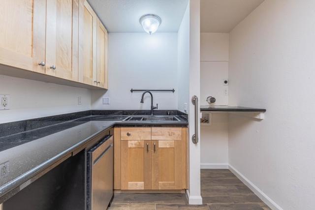 Rare Handicap unit with shower and space in kitchen to work. Tile floors make it easy to get around. Even a ramp from the parking space! Faces southwest so lots of sunshine. Storage unit at front patio for EZ access. Dog area close by, Pool and BBQ area to hang out all fenced and gated. This unit has lots of LED lights in the ceilings and wood blinds. Extra cabinets in the kitchen for storage plus inside laundry set up for separate washer and dryer units. Unit is in back of complex for privacy.