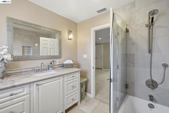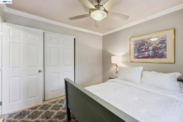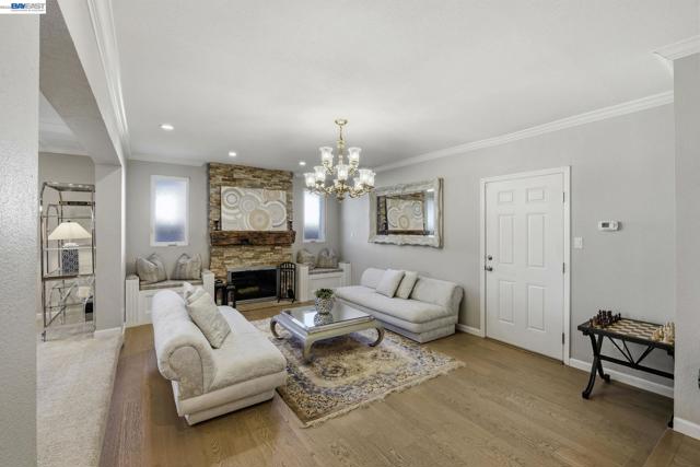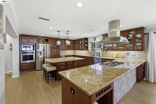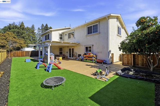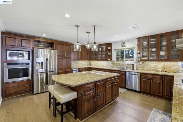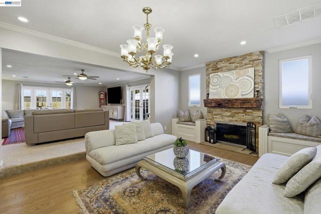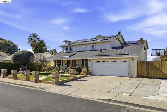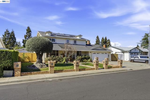 Beautifully upgraded executive home with an exceptional open-concept layout designed for entertaining. The massive showpiece kitchen features granite counters, center island, newer stainless appliances, beverage center with beer keg, and sightlines to multiple living spaces plus a grand dining area. Offering 3,894± sq ft, this expansive home includes 5 bedrooms, 4 full baths, a main-level bedroom and bath, spacious bonus room, and a versatile detached 10' x 16' shed ideal for office, gym, or studio. Elegant upgrades include French Oak flooring, remodeled baths, newer carpet, fresh interior paint, recessed LED lighting, designer fixtures, new roof, and newer HVAC with updated ducting. Smart features include keyless entry, automated blinds and patio louvers, Ring doorbell, and owned 13.6KW solar. Enjoy a private backyard retreat with no rear neighbors, mature fruit trees, spa, and covered patio. Prime location near BART, trails, and local amenities.