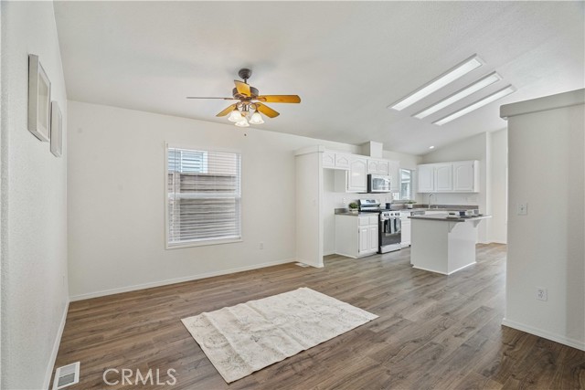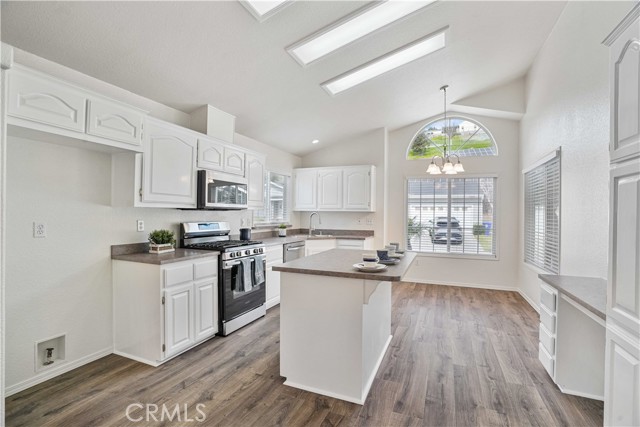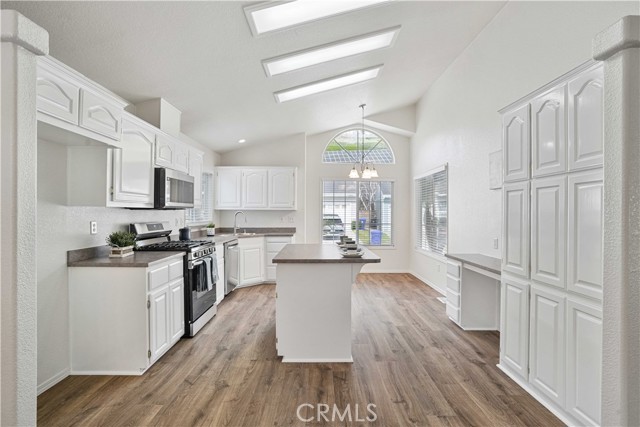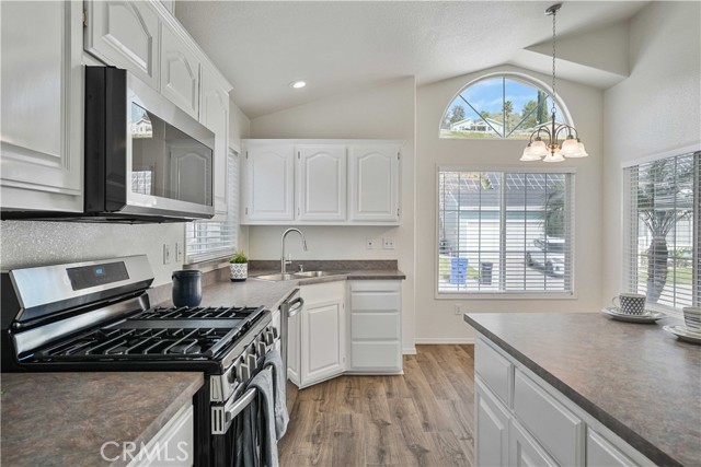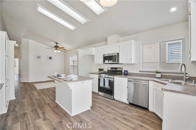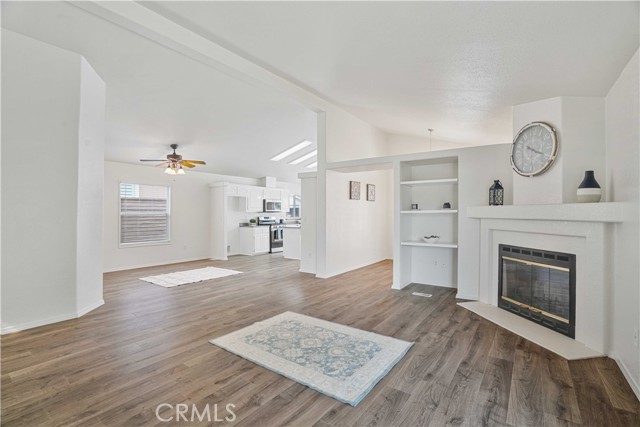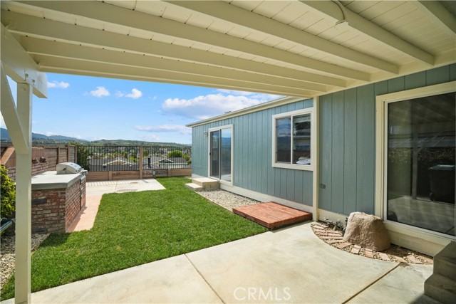 Beautifully updated 3-bedroom, 2-bath home featuring fresh interior and exterior paint, new luxury vinyl plank flooring, new carpet, and tile in the primary bath. The inviting living room offers a fireplace with built-in shelving. The kitchen is well-equipped with a center island, built-in desk, stainless steel appliances, built-in microwave, and fresh white cabinetry with ample storage. Ceiling fans throughout and a dedicated laundry room add comfort and convenience. The primary suite includes an en-suite bath for added privacy with separate dual vanities. The backyard is designed for entertaining with new sod, a custom-built BBQ with brick accents and cement prep countertops, outdoor lighting, a covered patio slab, and an additional seating area with a view. Move-in ready with modern updates and functional living spaces throughout. Located within Canyon View Estates, the home carries a monthly land lease of $1,886.22, which includes access to community amenities such as two pools and spa, sport courts, playgrounds, 24-hour gated security, clubhouse, and RV storage. Conveniently close to shopping, dining, schools, parks, and commuter routes. Don’t miss the opportunity to own this updated, move-in ready home in a quiet and friendly community. Please submit pre-approval and proof of funds with your offer. Buyer to verify all information prior to close of escrow.