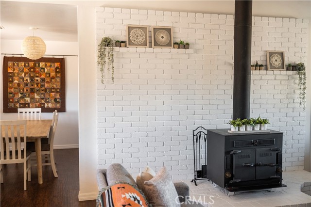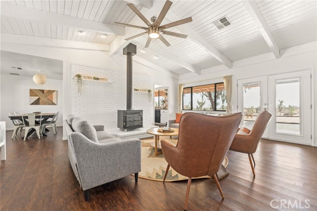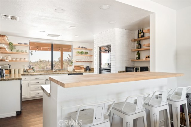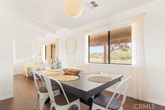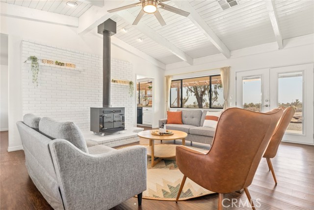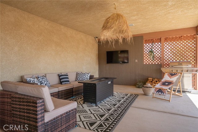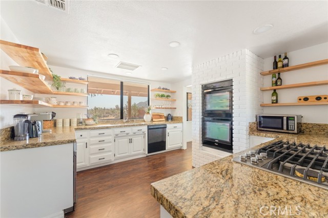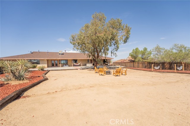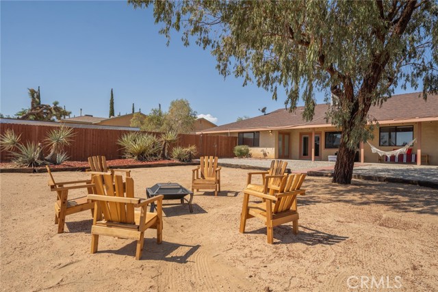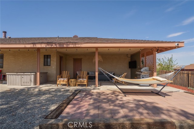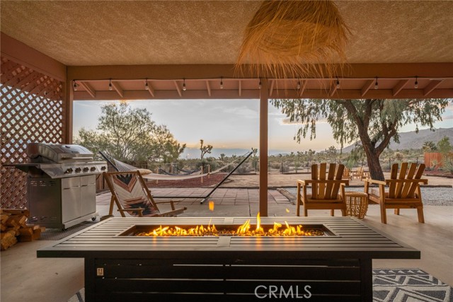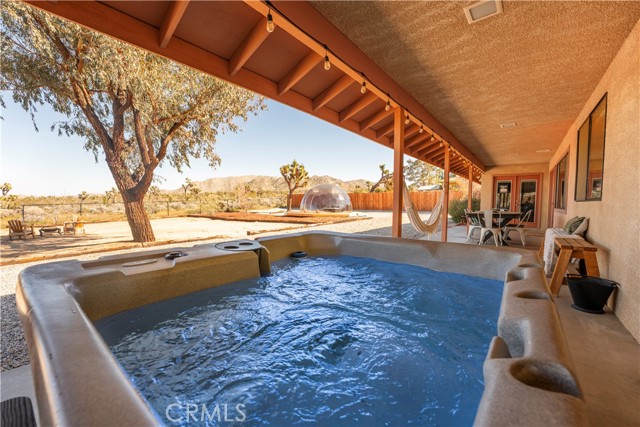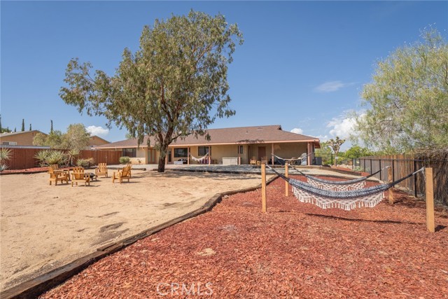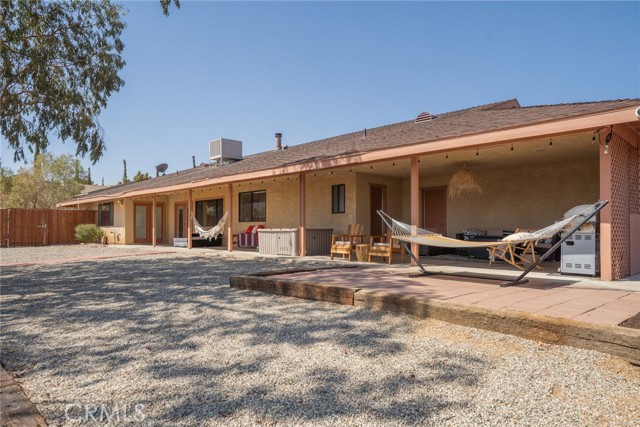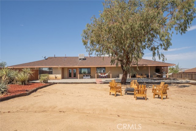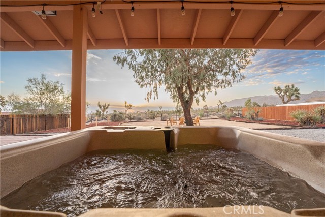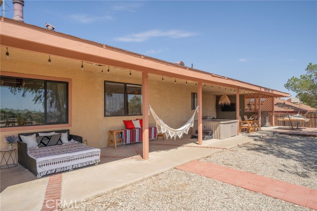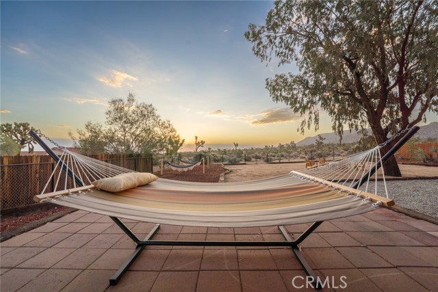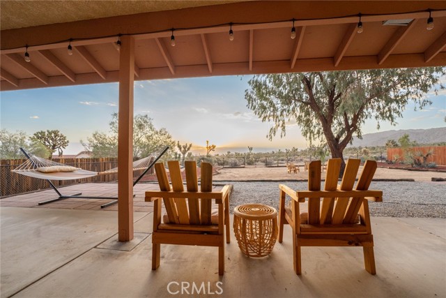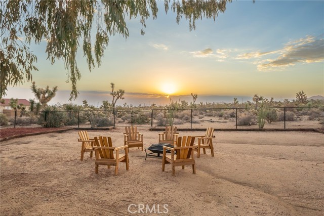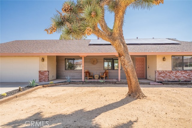 Coveted Western Hills Ranchos home - panoramic views of Joshua Tree National Park and vast wilderness from the backyard. Watch the sunrise from the back porch overlooking a forest of Joshua trees. Location is convenient to town and shopping yet has a rural feel on the eastern edge of town. Large home with nearly 1,900 square feet of living space, including three large bedrooms and three bathrooms. Living room is spacious with brick accents, a wood burning stove, and exposed wood-beamed ceiling. Rare formal dining room with built-in cabinets and a wide hallway with more built-in cabinets, in addition to a 3-car garage approximately 800 square feet; plenty of interior living space for entertaining or work-at-home areas and vast storage space throughout. PAID SOLAR for energy efficiency and reduced power bills. Natural gas meter (so no propane bills). Central AC/Heating. Mature landscaping with irrigation. Underground utilities, so no unsightly power cable running from a pole on the street. Fenced backyard for pets or children. Indoor/outdoor living at its best, with a sublime back porch with hot-tub, special areas for seating, including a dome for stargazing at night. Few homes on the market have so many upgraded interior and exterior living spaces – a must-see perfect forever home.