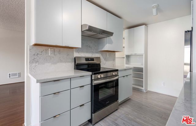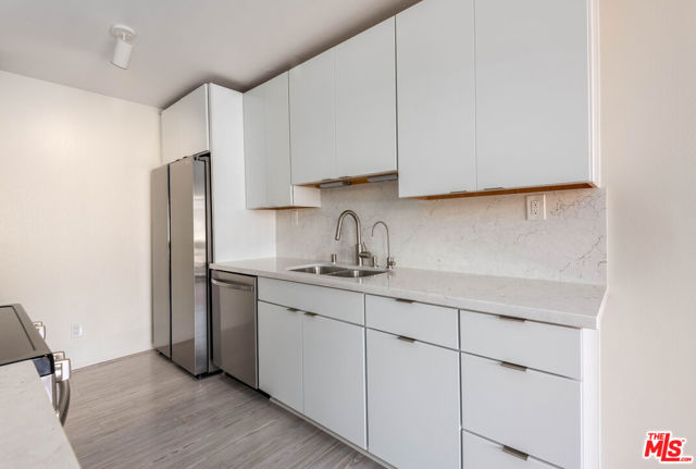 Bright and move-in ready, this appealing property offers a spacious living room filled with natural light from large double-paned windows, creating an inviting place to relax or entertain. The fully-remodeled contemporary kitchen features sleek quartz countertops and full-height backsplashes, stainless-steel appliances, and abundant storage that makes cooking feel effortless, supported by a new electrical subpanel. Adjacent to the kitchen is the dining area that opens to a breezy covered balcony where you can enjoy al fresco dining and pleasant weather. The private ensuite includes a generous walk-in closet, while the stylish bathroom showcases a large floating vanity for a clean, modern look. Enjoy the convenience of two gated subterranean side-by-side gated parking spots with storage cabinets, and the luxury of a resort-style complex with an outdoor pool and sundeck, gym, on-site manager, package storage lockers, and patrolled security. Ideally located close to parks, shopping, dining, and major transportation hubs, this home blends comfort, style, and everyday convenience in one appealing package.