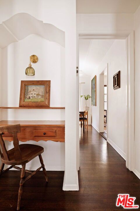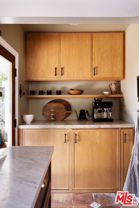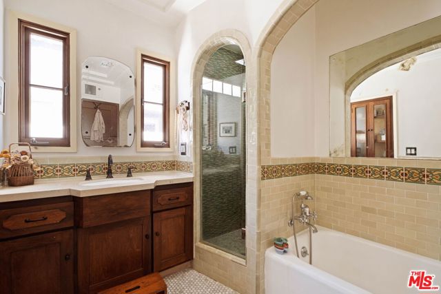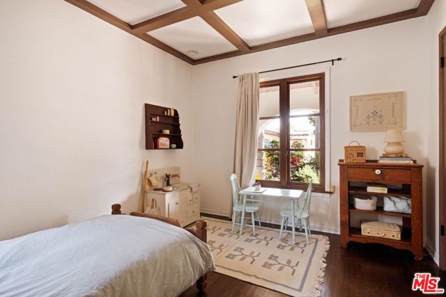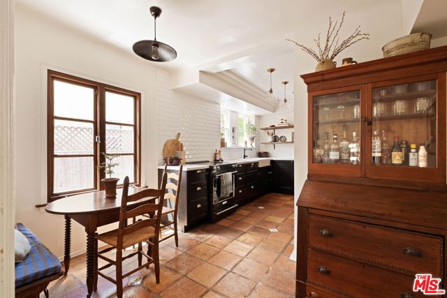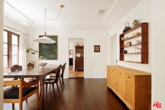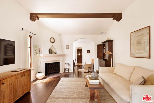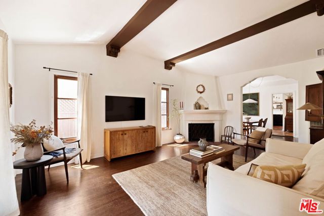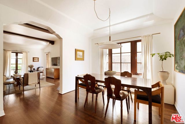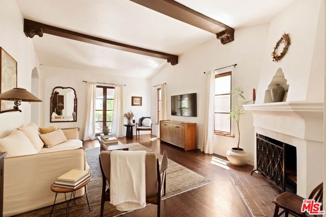 Set on a quiet street, this hard-to-find, truly authentic Spanish home holds onto the character that defines it, with exposed beams, warm wood floors, Saltillo tile, arched doorways and details that give the home its sense of history and charm. The living room is filled with natural light and anchored by a corner fireplace, with a classic arched opening to the dining room. At the center is a recently updated kitchen that feels both current and in keeping with the home, with marble countertops, open shelving, and paneled appliances. The layout remains practical and connected, with an intimate eat-in area at one end and, at the other, beautiful oak built-ins that add both warmth and function while neatly integrating the laundry. The bedrooms are well proportioned and comfortable. The primary sits toward the back with doors that open directly to the yard, bringing in light and creating an easy indoor-outdoor flow. The en-suite bath is bright and thoughtfully finished, while the second bath offers a soaking tub, rain shower, and built-in storage with a simple, classic sensibility. Outdoors, the yard is open and inviting, with mature trees, thoughtful planting, and a dedicated vegetable garden that give it a quiet, magical feel. It is a space that feels established and easy to enjoy, whether for everyday living or gathering with friends. The finished garage offers excellent built-in storage and flexibility, with potential to evolve over time depending on your needs. Homes like this do not come along often, where the character is still intact and the updates feel in line with what was always here, a true Spanish at heart.