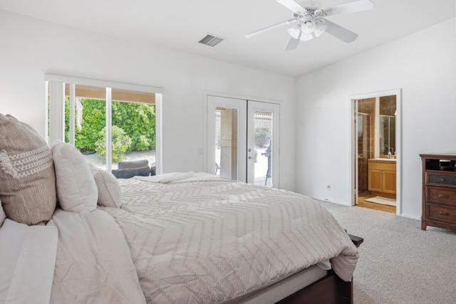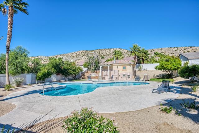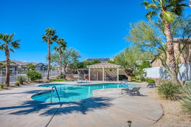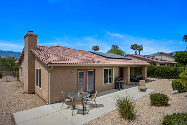 A Mission Lakes Country Club beauty offered fully furnished with owned solar, updated HVAC system, and in impeccable condition just a short distance from the golf course and clubhouse. This thoughtfully designed 3-bedroom, 3-bath residence spans approximately 1,890 square feet and the average electricity bill is about $20 a month. The home showcases vaulted ceilings and tile flooring throughout, creating a bright and open living environment. The expansive main living area features a natural gas fireplace that flows seamlessly into the dining space and a generous kitchen complete with granite surfaces, ample storage, a double oven, and a newer Samsung refrigerator. The primary suite offers a spacious retreat with a custom walk-in shower and large closet. Additional highlights include an indoor laundry room with washer and gas dryer, and an attached 2-car garage with golf cart parking and a 240-volt outlet for electric vehicle charging. Outside, the low-maintenance, drought-tolerant landscaping enhances both curb appeal and efficiency. The private backyard is designed for relaxation, featuring a covered patio, outdoor seating, firepit, and natural gas barbecue. Residents also enjoy an unlimited golf membership for two, fitness club, pool, included with the monthly HOA dues.