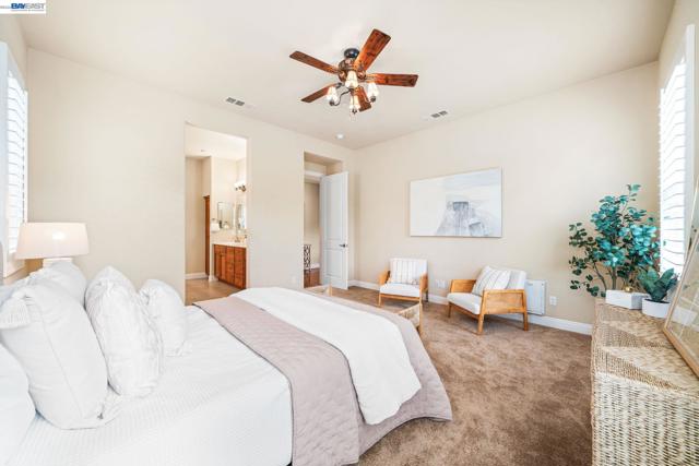 Located in the gated 55+ community of Trilogy Vineyards, this well-maintained 2BD/2BA home offers resort-style living with access to pools, spa, event center, bocce, tennis, and pickleball. Interior features include neutral flooring, custom shutters, recessed lighting, and carpeted bedrooms with ceiling fans. Spacious primary suite with walk-in closet, dual vanities, and oversized walk-in shower. Kitchen with stone countertops, large island with bar seating, and stainless steel appliances. Laundry room with built-in desk and storage off attached 2-car garage. Private backyard with retractable covered patio, mature landscaping, and owned solar.