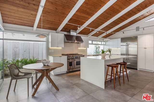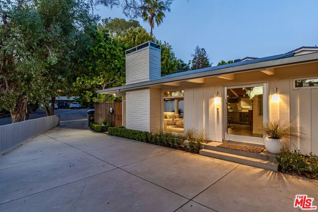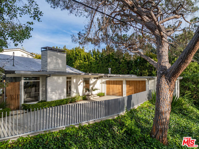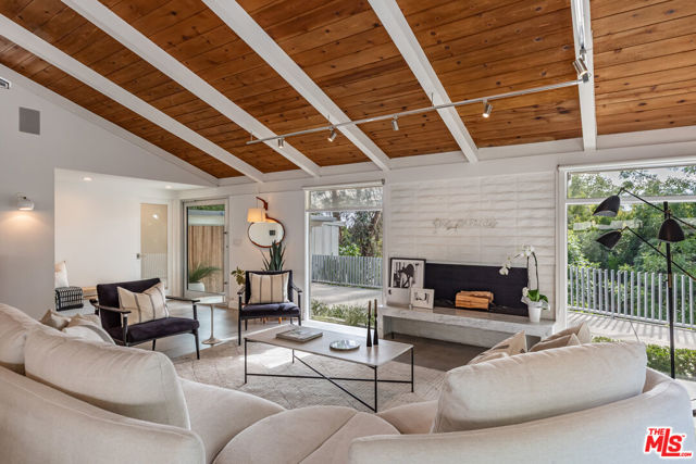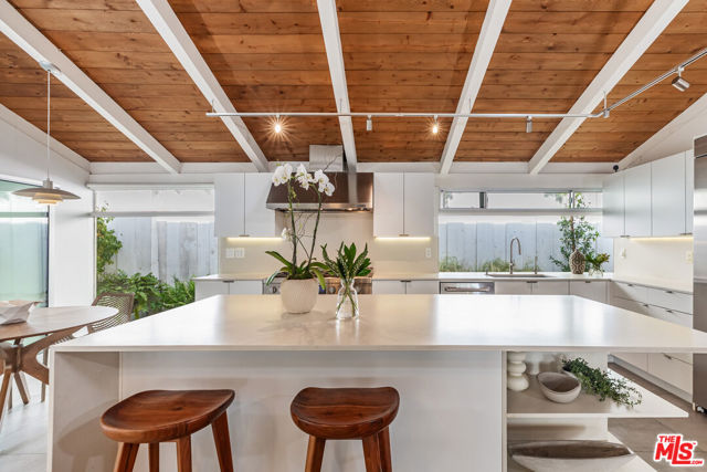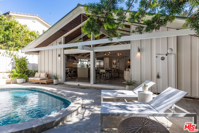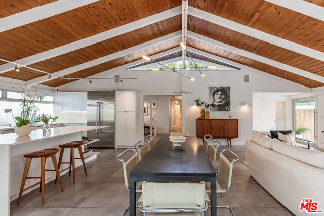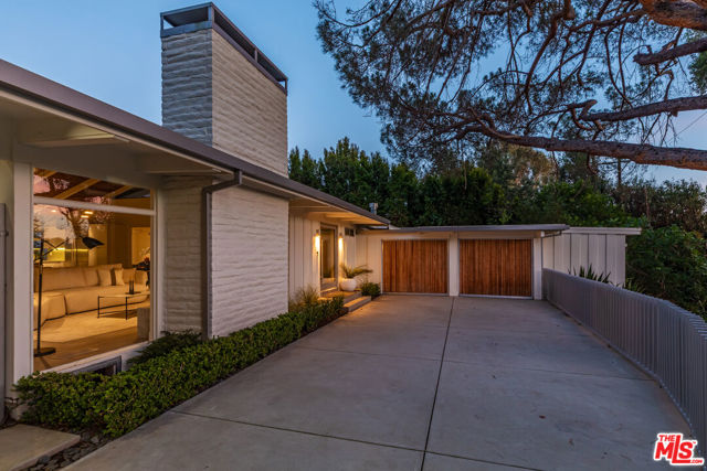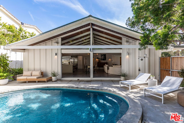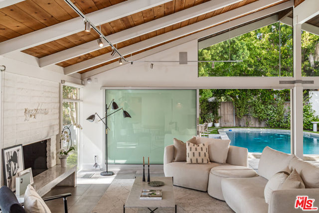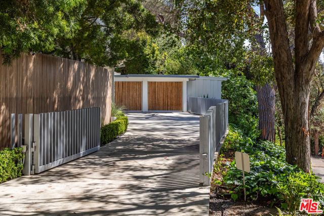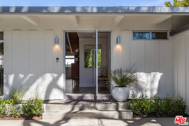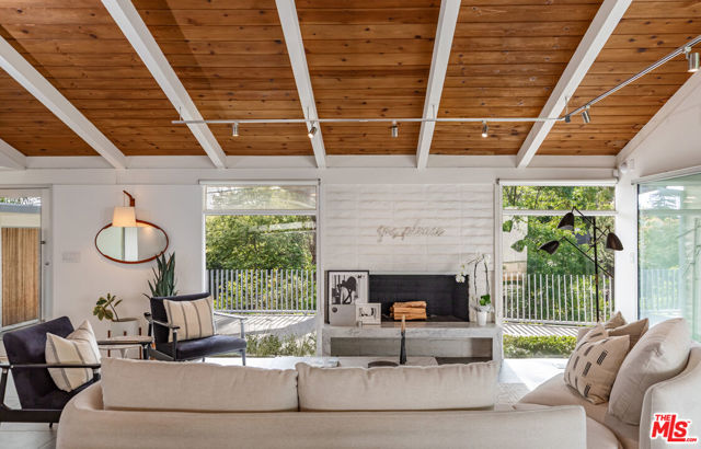 Beautifully nestled within this highly coveted Brentwood Flats neighborhood, just moments from Brentwood's best shopping and dining, this authentic Cliff May Mid-Century masterpiece offers exceptional architecture with 3 bedrooms, 2.5 baths, a versatile office/den, and great room opening to a private outdoor paradise. Embodying timeless California design, 586 Lorna Lane is where architecture, light, and landscape are seamlessly integrated. Proudly positioned atop a secluded driveway and behind a gated entry at the end of a private road serving only a select few homes, this property offers a rare sense of seclusion. A striking white facade opens to warm interiors defined by dramatically pitched wood beamed ceilings and a grand, light-filled living space. The living room with central fireplace flows seamlessly into a central dining area and tastefully updated kitchen, all unified by a refined palette of neutral whites, soft grays, and natural stone. Expansive sliding glass doors span the main living area's tall A-frame, a hallmark of Cliff May design, creating a seamless indoor-outdoor connection as the spaces open entirely to the resort-like backyard and lagoon-style pool, allowing for effortless entertaining and everyday living. The kitchen is appointed with high-end stainless steel appliances, a wine fridge, and clean, understated finishes that complement the home's architectural character. An adjacent den offers additional flexibility for lounging, media, or workspace. The primary suite feels like a private retreat, complete with a vintage Malm fireplace, walk-in closet, additional lounging nook and direct access to the outdoors. The spa-inspired bath features a soaking tub, dual vanities, and a walk-in shower set against striking black pebble flooring. Two additional bedrooms offer seamless built-in closets and share a well-appointed full bath, accented by a striking stone vessel sink. Outdoors, a privately hedged setting surrounds a sparkling heated saltwater pool - an ideal backdrop for both relaxation and entertaining. The two-car garage includes one space curated as an office or gym with a mini-split system, offering lifestyle-driven flexibility and functionality. Don't miss this rare offering that honors architectural heritage while embracing modern comfort in one of Brentwood's most sought-after enclaves. 586 Lorna Lane is a true testament to Cliff May's vision of the post-war California dream home.