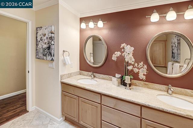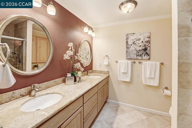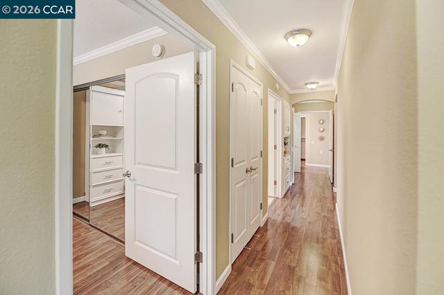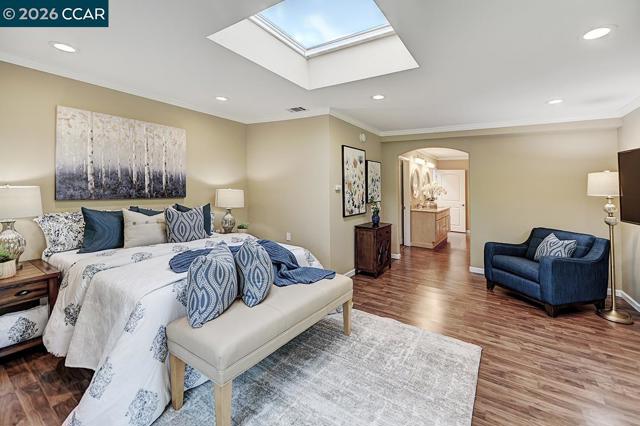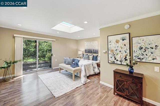 Unique Rossmoor condo with dramatic pitched ceilings and a creekside setting near golf course and Gateway Community Center. The airy great room, walls of windows, three skylights, and serene green outlooks create a comfortable space that lives like a charming private cottage—your own corner of the world—yet close to amenities. Over 1,300 sq ft with luxury vinyl plank flooring, crown molding, and smooth ceilings. Updated kitchen with solid-surface counters, gas range, pull-outs, and pantry. “New” heating, A/C and water heater. New skylights. Both baths feature dual sinks; the primary suite offers two walk-in closets. Only one shared wall—rare for this model—offers enhanced privacy. Enjoy Rossmoor’s 55+ lifestyle with golf, pools, 10 miles of trails, parks, fitness center, clubs, art studio, concerts, dances, music, gaming (Bridge/Mah Jong), dog park, events, and more. Jump in and join in!