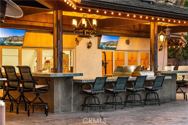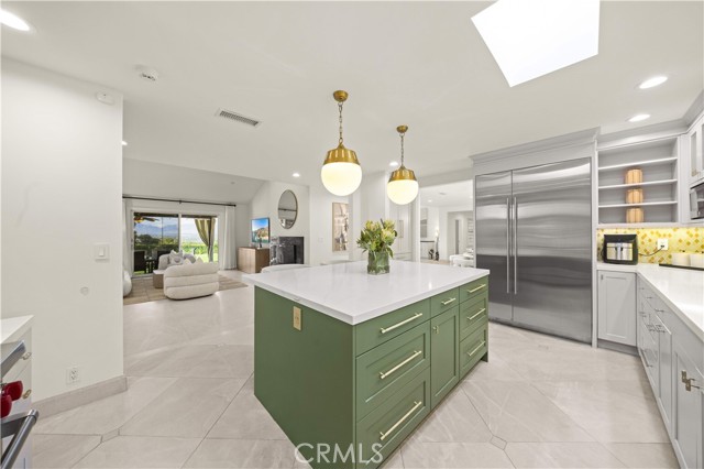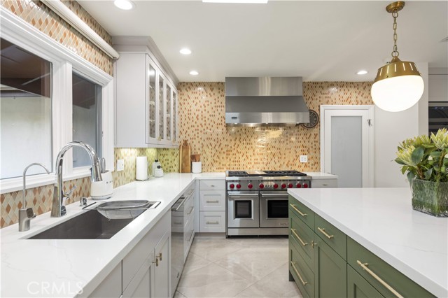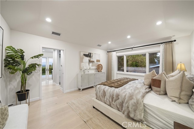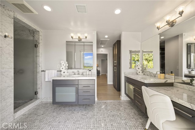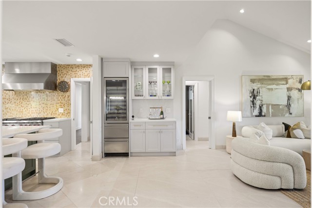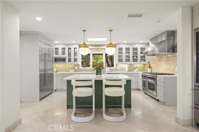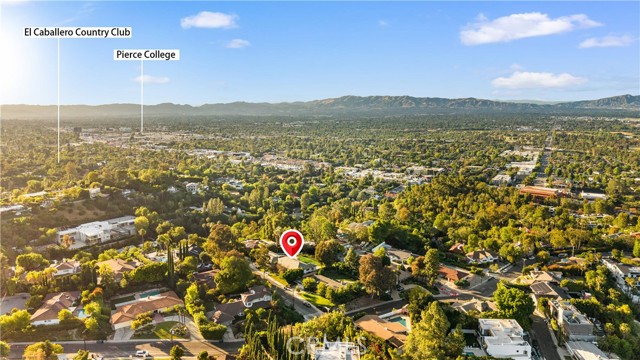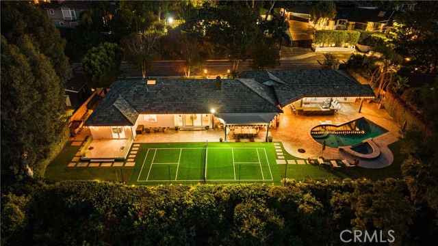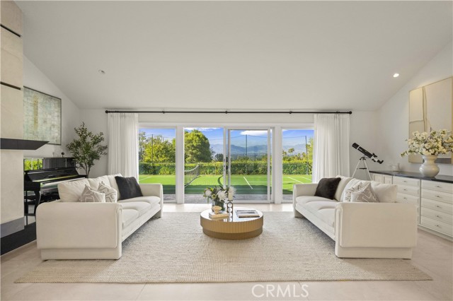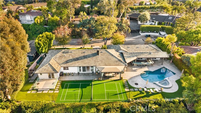 Located on a quiet cul-de-sac in the Encino Hills, this single-story residence offers 5 bedrooms and 5 bathrooms across approximately 3,775 sqft, set on an expansive flat lot of about 17,000 sqft with sweeping city and mountain views. The home features a functional single-level floor plan with main living areas at the center and separate bedroom wings for privacy. Upon entry, open sightlines extend through the living area to the backyard, enhanced by vaulted ceilings, clean lines, and expansive sliding doors that bring in natural light. The living room includes a double-sided fireplace and connects seamlessly to the dining area and kitchen. The updated kitchen features a large center island, stone countertops, and high-end appliances including a 48” Sub-Zero refrigerator, Wolf range, and Cove dishwasher. The primary suite offers direct access to a private patio, along with a remodeled spa-style bathroom and walk-in closet. A guest suite near the garage includes a dressing area and full bath, ideal for guests or extended living. Upgrades include updated plumbing and drainage, new water heater, remodeled bathrooms with Kohler fixtures, solid wood flooring in bedrooms, whole-house water filtration, Nest-controlled HVAC, upgraded network wiring, and a comprehensive security system. The backyard offers a rare flat hillside setting with panoramic valley views, a pool and spa, built-in BBQ, multiple seating areas, and a private sport court suitable for pickleball. No HOA or Mello-Roos. A rare opportunity for refined single-story living in a prime Encino Hills location.