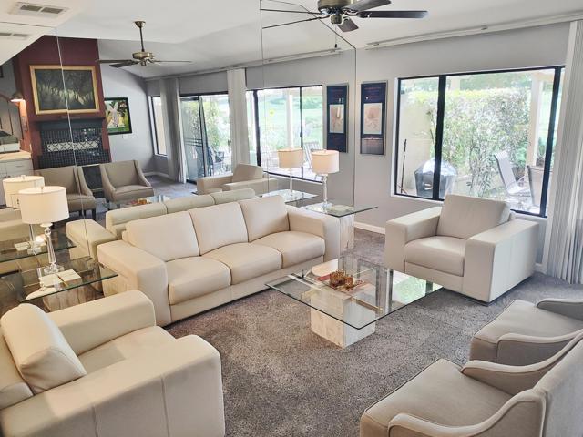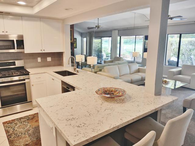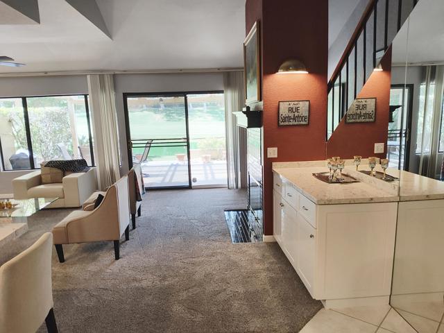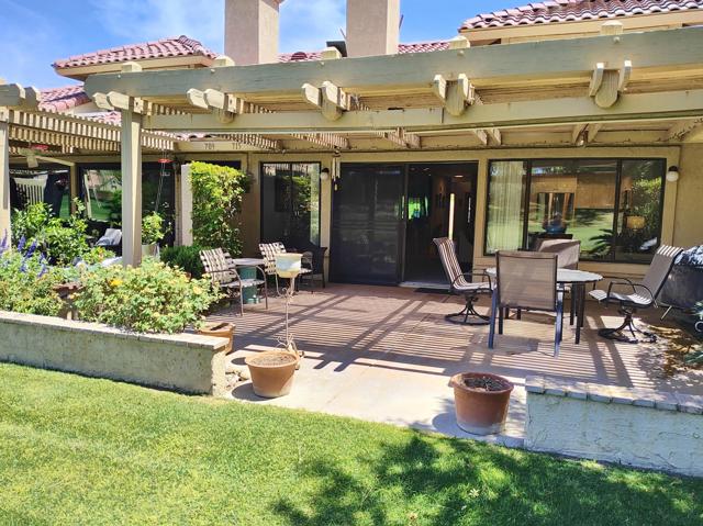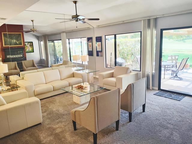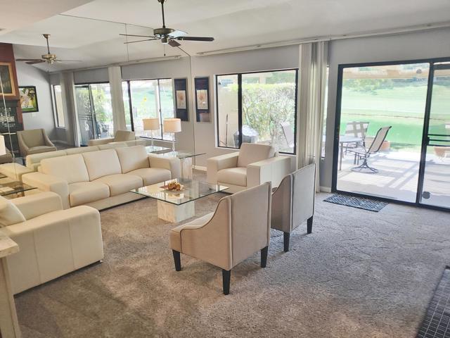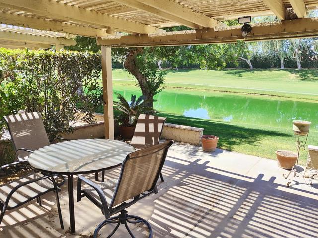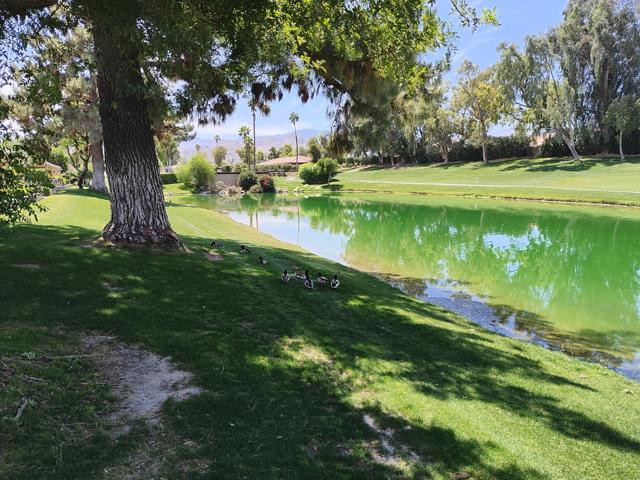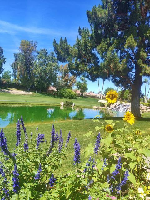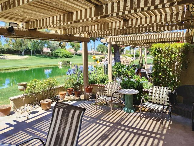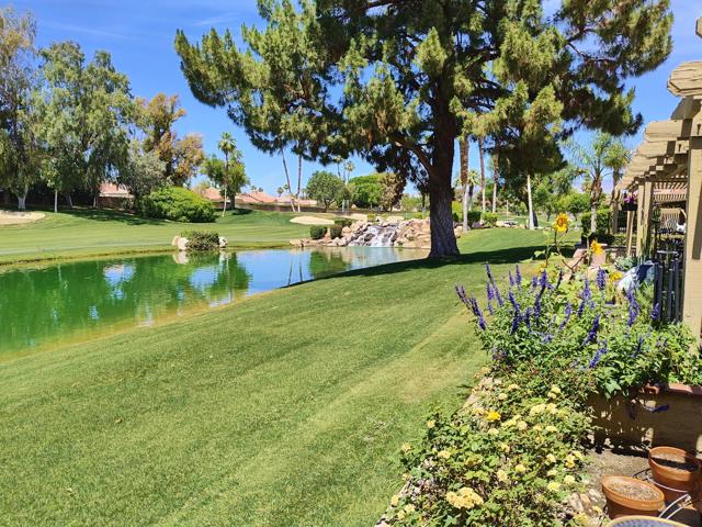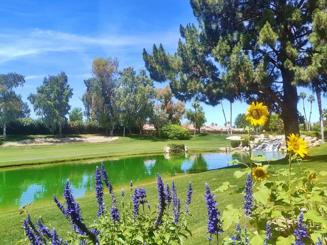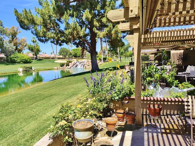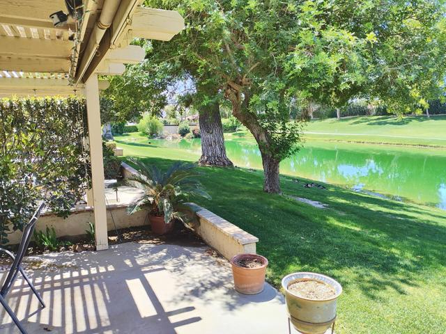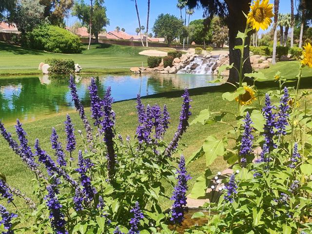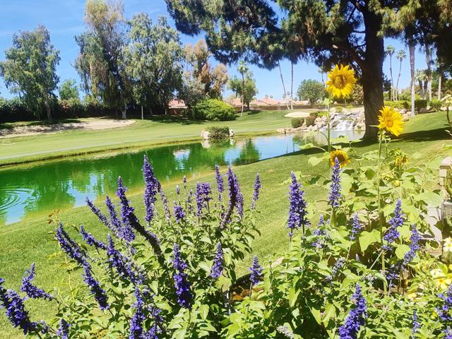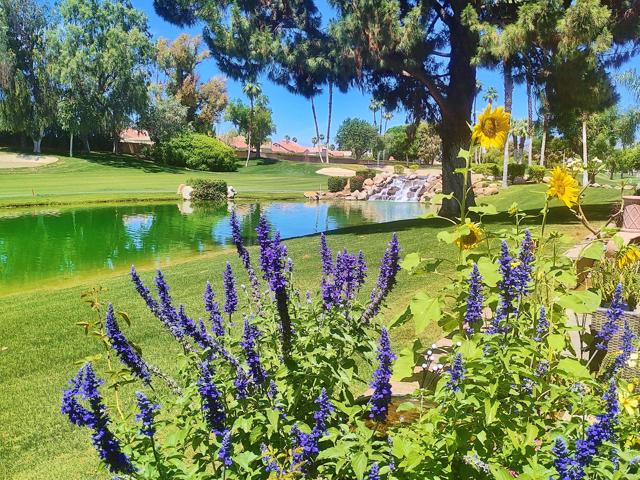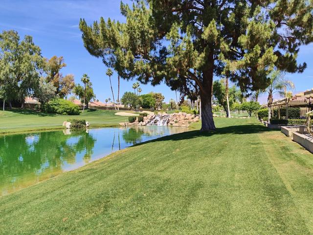Welcome to a rare offering inside the prestigious gated Woodhaven Country Club--where comfort, beauty, and effortless desert living come together.This beautifully appointed 2-bedroom plus den, 3-bath condo enjoys one of the most coveted locations in the community. Perfectly positioned on the golf course, the home overlooks a tranquil lake with the soothing backdrop of a picturesque waterfall--creating a setting that feels both private and resort-like.Inside, the updated kitchen features a clean, modern design ideal for everyday living or entertaining. Natural light fills the home thanks to its optimal orientation, offering bright, sunny interiors throughout the day, while mature shade trees to the west provide welcome relief from the summer heat.Step outside to your back patio and discover a truly special touch: a lush, flower-filled garden that attracts hummingbirds, adding a bit of charm and whimsy to your daily routine. Whether enjoying morning coffee or an evening glass of wine, the views and ambiance are simply exceptional.Additional highlights include an attached 2-car garage and affordable HOA dues, enhancing both convenience and value. The home is offered turnkey furnished--complete with dishes, linens, and decor (with a few exclusions)--making it truly move-in ready from day one.Whether you're seeking a full-time residence or a serene escape from colder climates, this home delivers an inviting blend of style, comfort, and unforgettable surroundings. Come make this your oasis under palm trees!