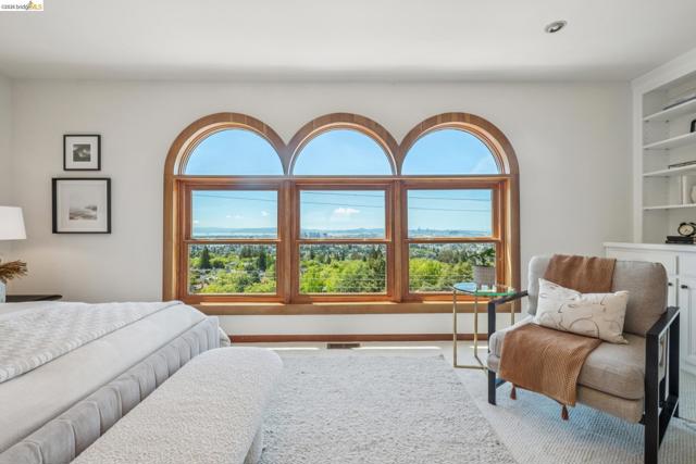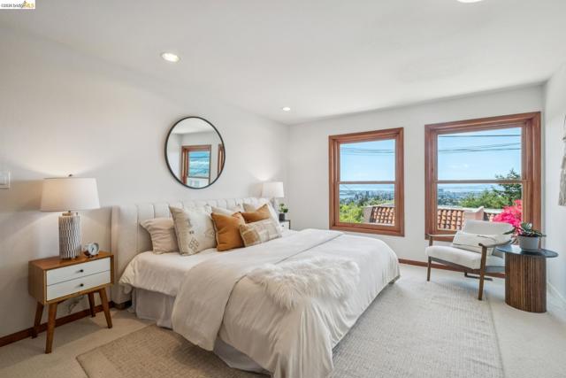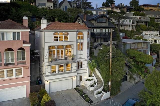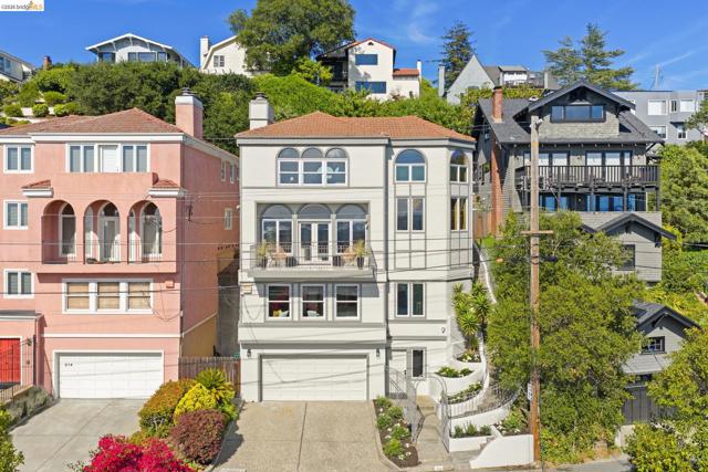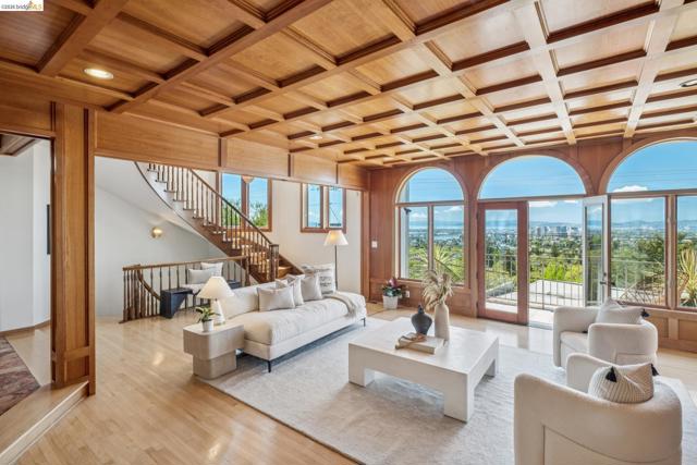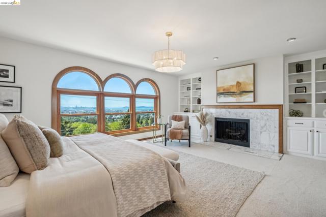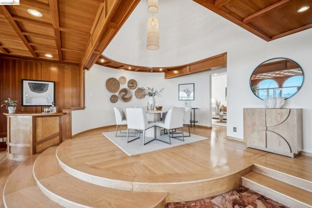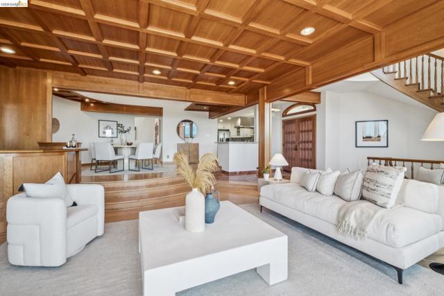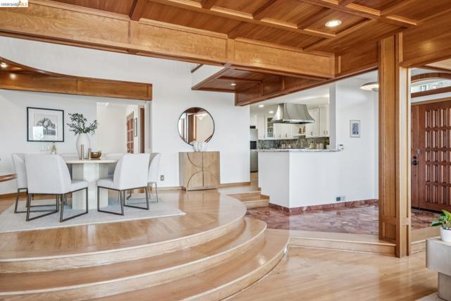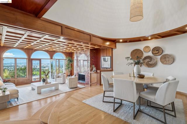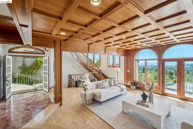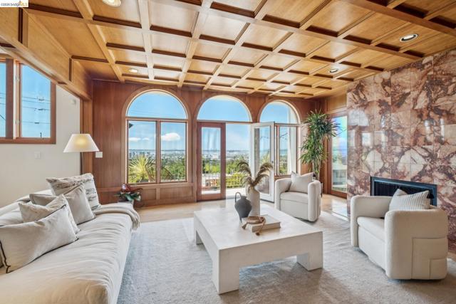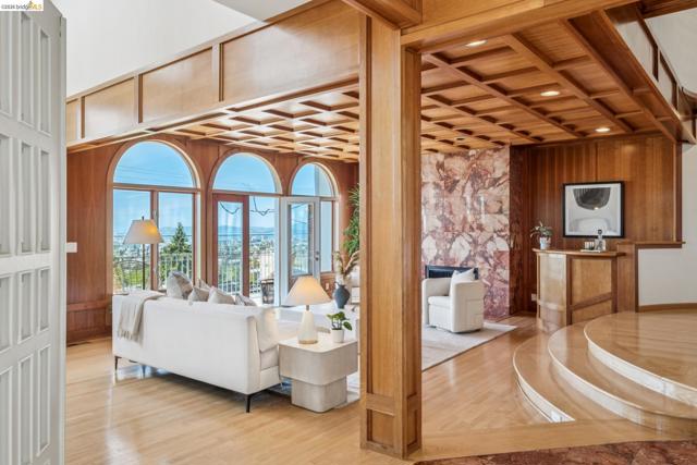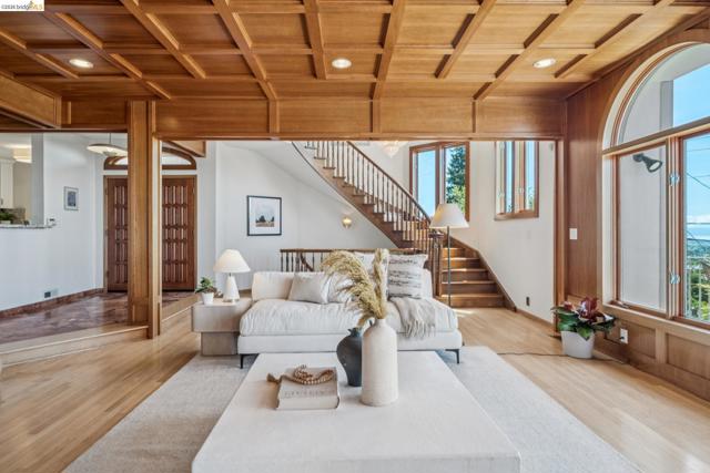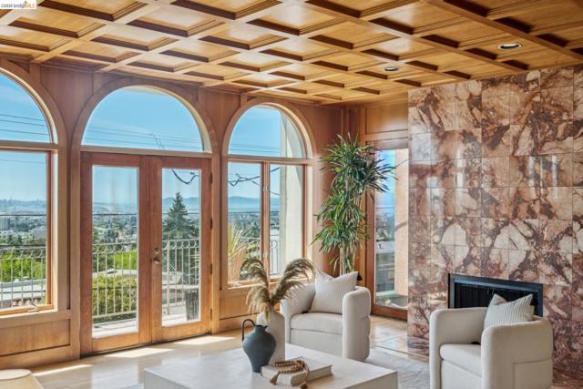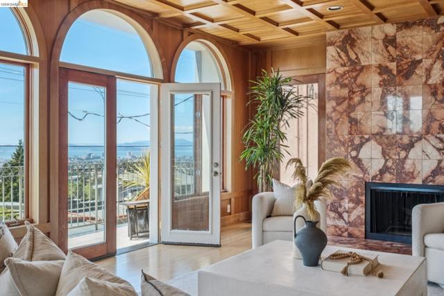 With sweeping views that stretch from downtown Oakland to the San Francisco skyline and beyond, this multi-level Piedmont home enjoys an ideal location just blocks from the center of town. Designed for both comfortable daily living and effortless entertaining, 210 Scenic Ave. offers scale, character, and exceptional function. At its center is a dramatic living room with stately box-beamed ceilings, a striking stone fireplace wall, and a balcony that invites you to step outside and take in the ever-changing vistas. A dedicated curved bar area adds personality and creates a natural place to gather with friends and family. The adjacent dining room is equally memorable, with its graceful curved shape and cathedral ceilings that bring volume and light to the space. Nearby, the eat-in kitchen blends style and practicality with stainless steel appliances, a separate beverage fridge and freezer and a breakfast area. Upstairs, the primary suite is a private retreat, featuring breathtaking views, a cozy fireplace, and thoughtfully integrated built-in shelving. A spacious walk-in closet and en suite bath with a soaking tub complete the space. Three additional bedrooms, a full bath, and a conveniently located laundry area provide flexibility. The lower level includes a guest or au pair suite with its own full bath, offering privacy and comfort for extended stays. Throughout the home, curved staircases add architectural interest, while tile and gleaming wood floors bring warmth and polish. A two-car garage completes this exceptional Piedmont residence.