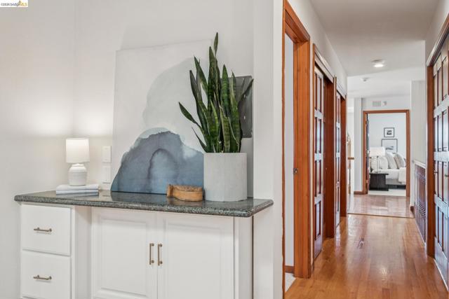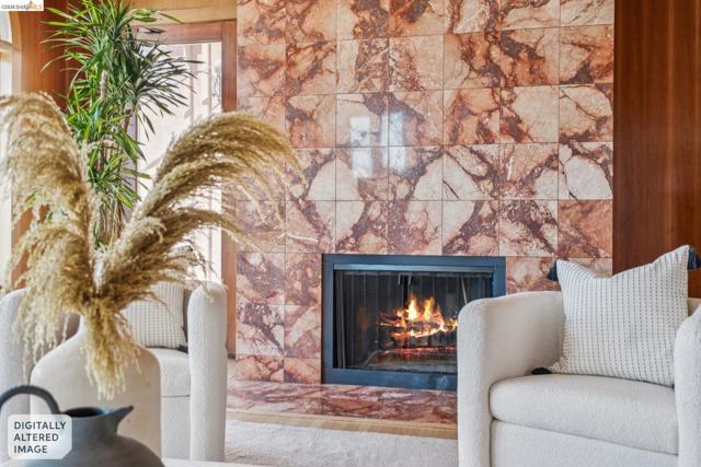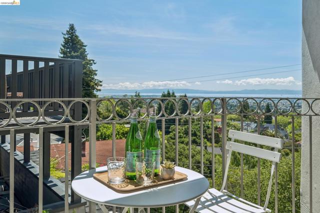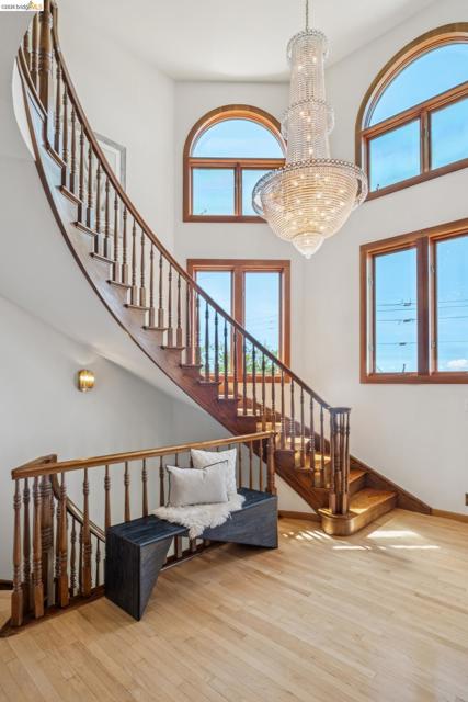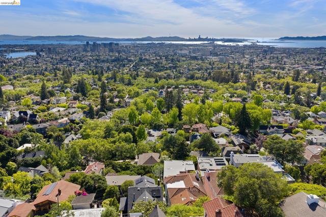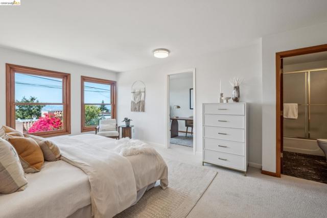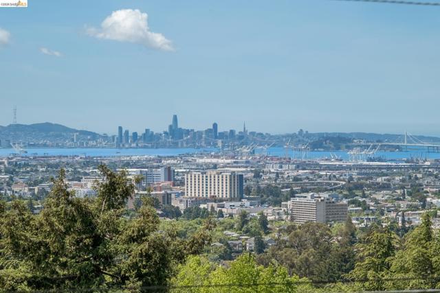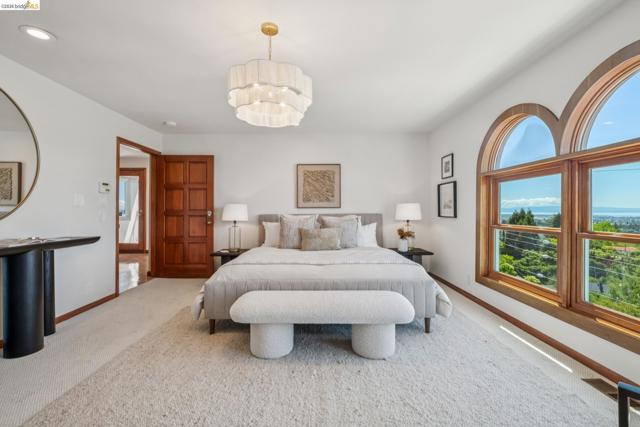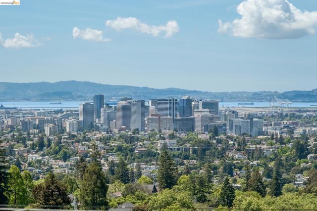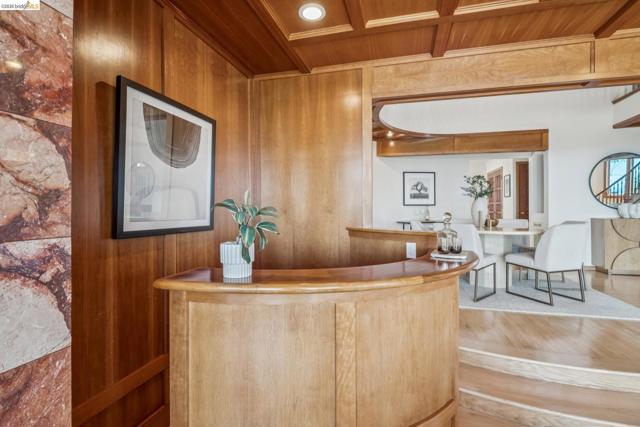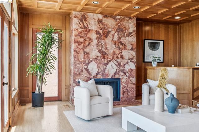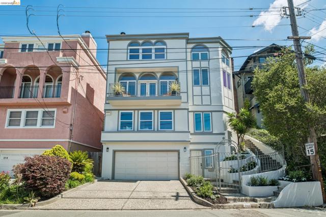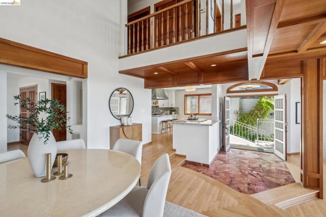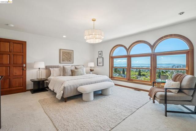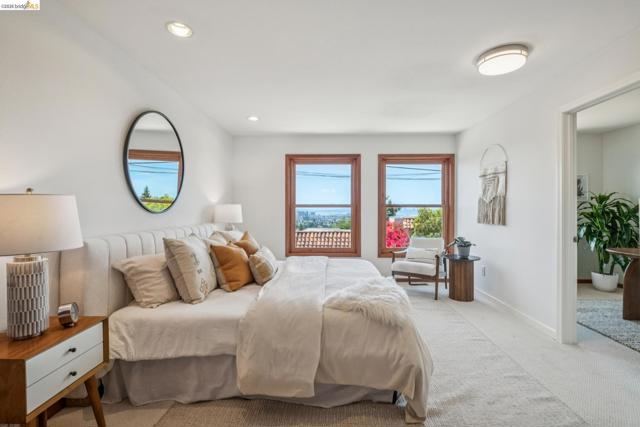 With sweeping views that stretch from downtown Oakland to the San Francisco skyline and beyond, this multi-level Piedmont home enjoys an ideal location just blocks from the center of town. Designed for both comfortable daily living and effortless entertaining, 210 Scenic Ave. offers scale, character, and exceptional function. At its center is a dramatic living room with stately box-beamed ceilings, a striking stone fireplace wall, and a balcony that invites you to step outside and take in the ever-changing vistas. A dedicated curved bar area adds personality and creates a natural place to gather with friends and family. The adjacent dining room is equally memorable, with its graceful curved shape and cathedral ceilings that bring volume and light to the space. Nearby, the eat-in kitchen blends style and practicality with stainless steel appliances, a separate beverage fridge and freezer and a breakfast area. Upstairs, the primary suite is a private retreat, featuring breathtaking views, a cozy fireplace, and thoughtfully integrated built-in shelving. A spacious walk-in closet and en suite bath with a soaking tub complete the space. Three additional bedrooms, a full bath, and a conveniently located laundry area provide flexibility. The lower level includes a guest or au pair suite with its own full bath, offering privacy and comfort for extended stays. Throughout the home, curved staircases add architectural interest, while tile and gleaming wood floors bring warmth and polish. A two-car garage completes this exceptional Piedmont residence.