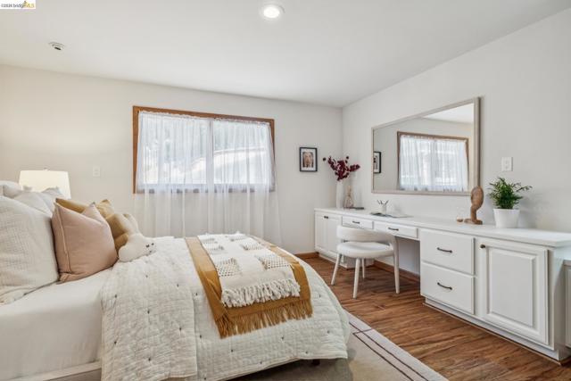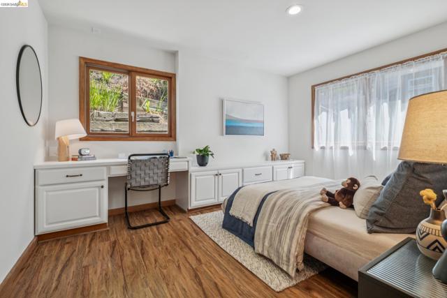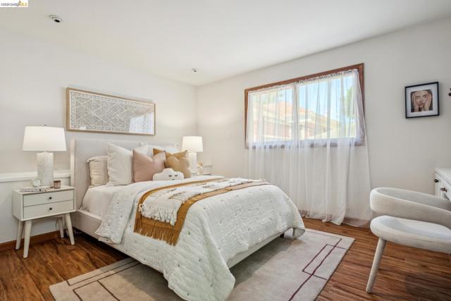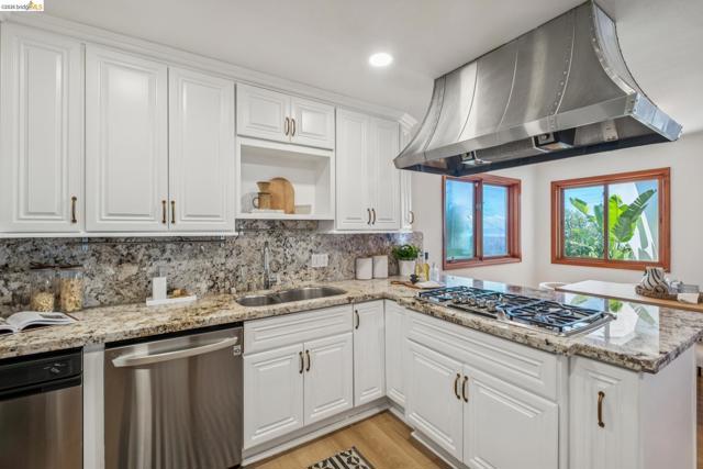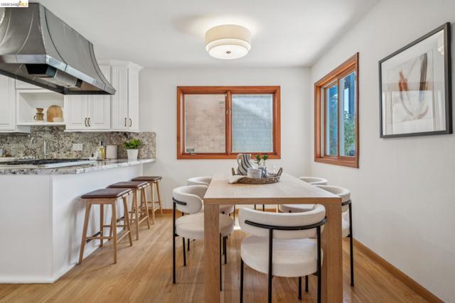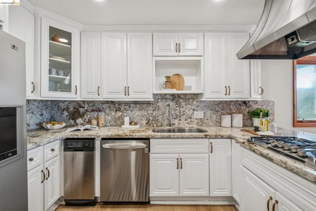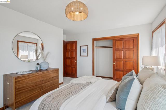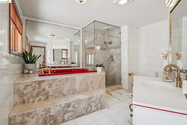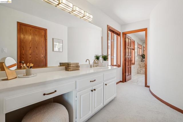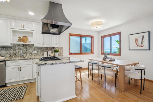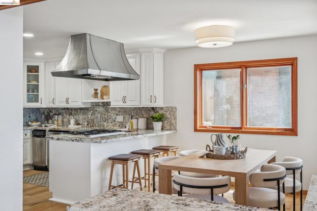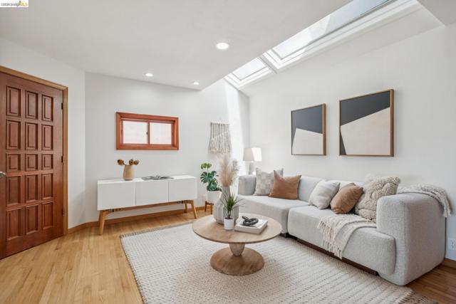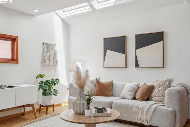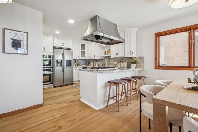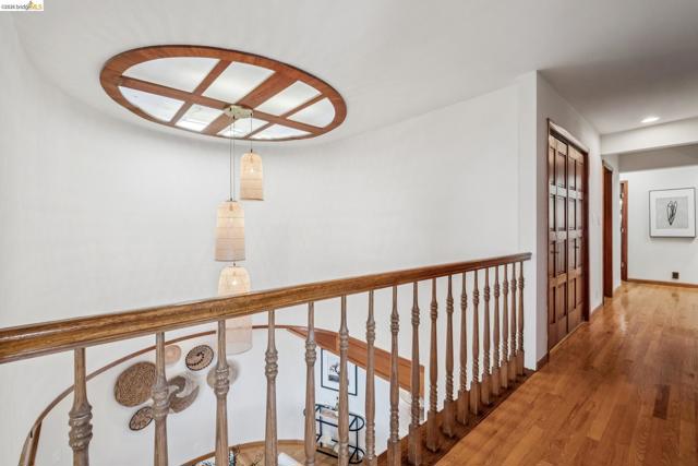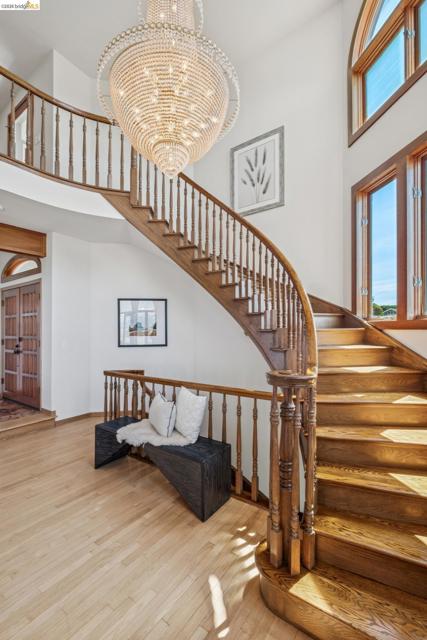 With sweeping views that stretch from downtown Oakland to the San Francisco skyline and beyond, this multi-level Piedmont home enjoys an ideal location just blocks from the center of town. Designed for both comfortable daily living and effortless entertaining, 210 Scenic Ave. offers scale, character, and exceptional function. At its center is a dramatic living room with stately box-beamed ceilings, a striking stone fireplace wall, and a balcony that invites you to step outside and take in the ever-changing vistas. A dedicated curved bar area adds personality and creates a natural place to gather with friends and family. The adjacent dining room is equally memorable, with its graceful curved shape and cathedral ceilings that bring volume and light to the space. Nearby, the eat-in kitchen blends style and practicality with stainless steel appliances, a separate beverage fridge and freezer and a breakfast area. Upstairs, the primary suite is a private retreat, featuring breathtaking views, a cozy fireplace, and thoughtfully integrated built-in shelving. A spacious walk-in closet and en suite bath with a soaking tub complete the space. Three additional bedrooms, a full bath, and a conveniently located laundry area provide flexibility. The lower level includes a guest or au pair suite with its own full bath, offering privacy and comfort for extended stays. Throughout the home, curved staircases add architectural interest, while tile and gleaming wood floors bring warmth and polish. A two-car garage completes this exceptional Piedmont residence.