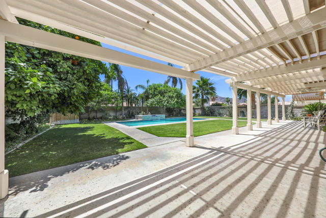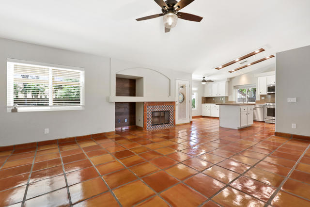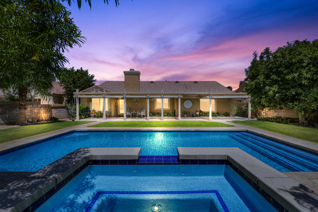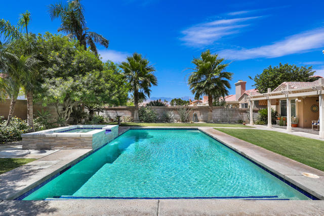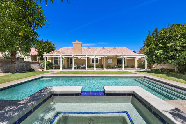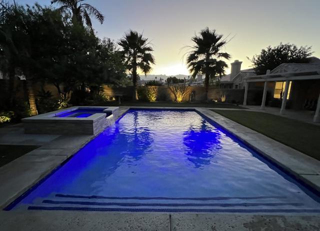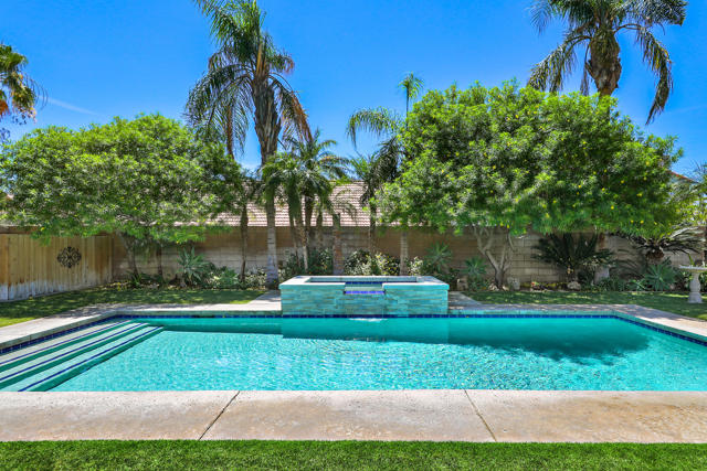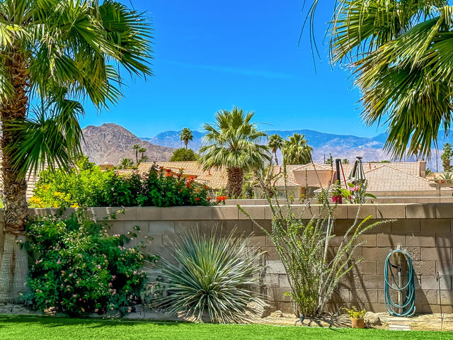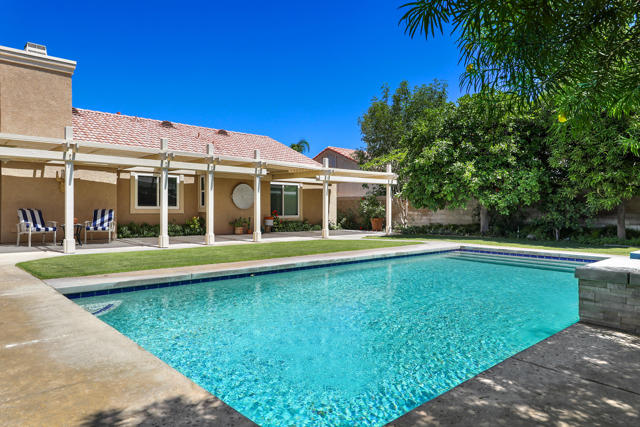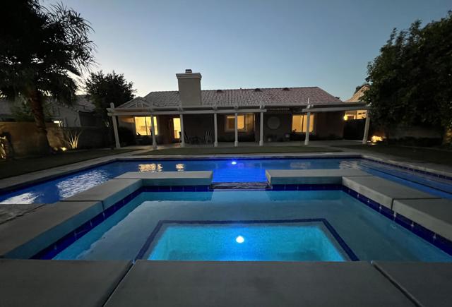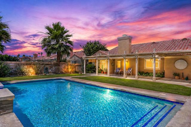 Open house 11:00 -2:00 Saturday and Sunday 4/24 and 4/25. Highly sought-after gorgeous home in the Topaz neighborhood conveniently located within walking distance to prestigious International Baccalaureate (IB) schools: Amelia Earhart Elementary, John Glenn Middle School and La Quinta High School. Designed for entertaining and everyday enjoyment, the recently upgraded PebbleTech saltwater pool and spa is the centerpiece of a beautiful back yard oasis. Updated pool pump, filter, heater, LED lighting, and pool chiller. Enjoy the dramatic mountain views and the lush landscaping and mature fruit trees in the expansive yard. This house was remodeled with Saltillo tile flooring throughout. Both bathrooms were totally renovated with walk-in shower, deep soaking tub, and spectacular tile and counter work. All windows were replaced, new shutters / blinds, upgraded 200A electrical panel, new attic fan, EV Charger. The living and dining room leads into an expansive family room with cathedral ceilings and lots of natural light. The upgraded kitchen area is complete with new appliances, center island and convenient breakfast nook, as well as granite counter tops. Wonderful neighborhood with no HOA dues. Perfect for a family, as a vacation home, or an investment / rental opportunity. This home sells itself.