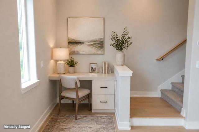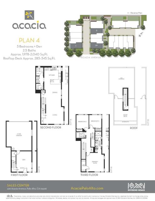 Homesite 1, Plan 4 at Acacia by Dividend Homes Desirable corner homesite featuring Plan 4 with 3 bedrooms + den and 2.5 baths, offering approx. 1,9782,040 sq ft. Bright, open-concept living with a spacious kitchen, large island, quartz countertops, pantry, and premium all-electric appliances. Upper level includes a private primary suite with walk-in closet, plus two additional bedrooms. Ground-level den provides flexible space for office or gym. Expansive rooftop deck (approx. 283345 sq ft) ideal for outdoor living and entertaining. Features include 2-car garage, solar, EV prewire, smart home system, and energy-efficient design. Located in Palo Alto Unified School District near parks, shopping, and major commute routes.