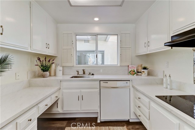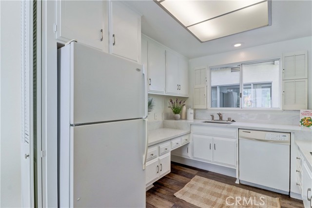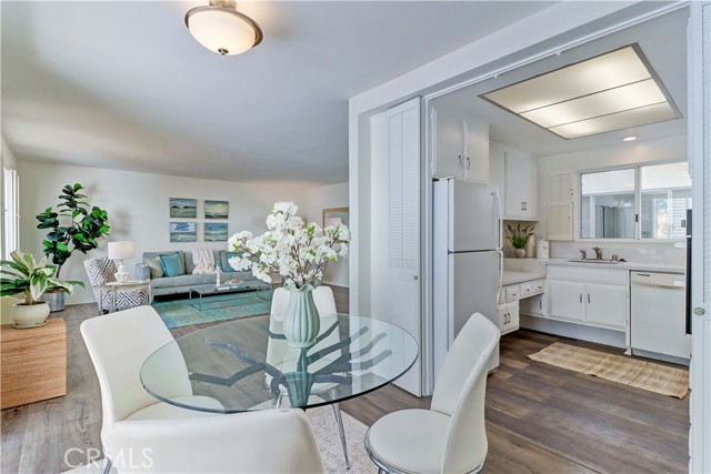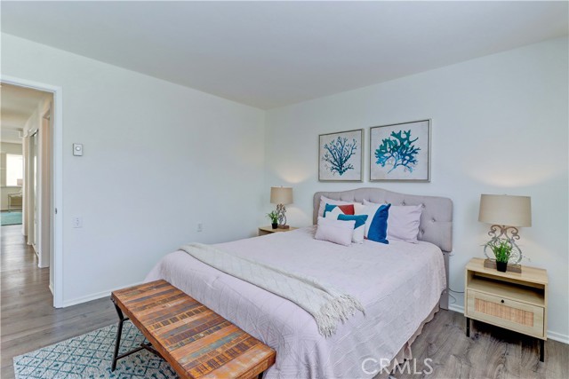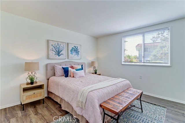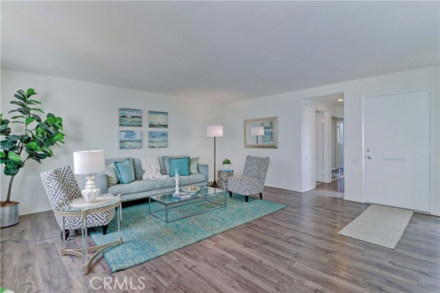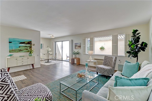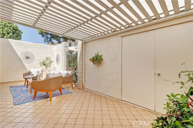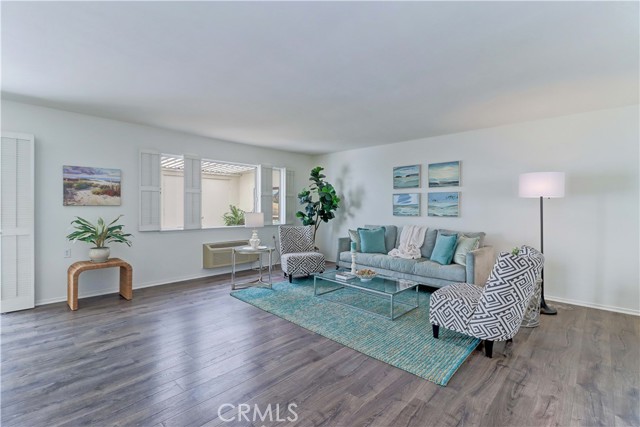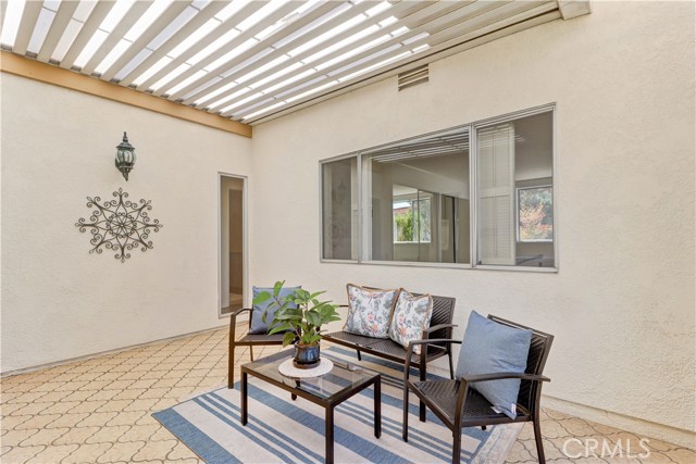 2BD/2BA updated, end unit "Cordoba" CONDO conveniently located in a quiet area on the western side of Gate 5/6 with easy access to the gates and Clubhouse 4 - the arts and crafts center of Laguna Woods with its own pool/spa. This is one of the largest single level cottage-type floorplans with room to expand into 2 patio areas. Enter through the partially covered front patio with rod iron gate. Interior features smooth ceilings, laminate flooring, fresh paint and shutters on most windows. Spacious living room and adjacent dining area lead out to the large, partially covered back patio with nice sized storage closets - plenty of room for outdoor living, gardening bench and BBQ. Living/dining and kitchen windows all face onto private patios so no neighbors walking by. Back inside, the kitchen has brand new quartz counters and window that looks out to the front patio area. 2 remodeled bathrooms with newer vanities and fixtures. Guest bathroom has tub/shower combo with tiled surround and curved glass enclosure. Primary bath houses tiled walk-in shower. 2 good sized bedrooms with lots of closet space behind the mirrored closet doors and west-facing windows for afternoon sun. The primary bedroom also has a window facing into the front patio. Comfortable home with space to spread out plus 2 patios! Carport and guest parking right in front. Residents enjoy access to an unparalleled array of amenities, including championship and executive golf courses, multiple swimming pools, fitness centers, pickleball and tennis courts, lawn bowling, equestrian facilities, gardening centers, art studios, computer labs, classes, and over 200 clubs and social organizations. See Virtual walk-through tour!