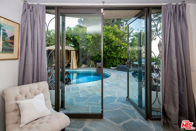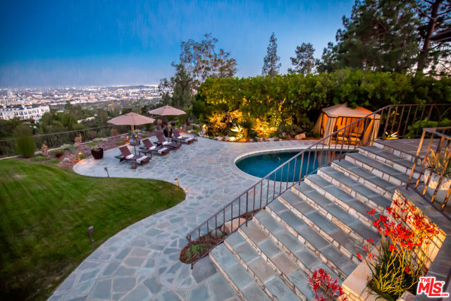 Dramatic, Secluded Contemporary perched on a rare 1+ acre promontory on one of Beverly Hills' most coveted cul-de-sac streets, offering commanding panoramic city and ocean views and exceptional privacy. Gated and serene, this 5,000+ sq-ft residence is designed for seamless indoor-outdoor living with expansive open spaces and walls of glass capturing breathtaking views throughout. The home features a stunning family room and refined chef's kitchen with Wolf and Sub-Zero appliances, custom wet bar, wine refrigerator, walk-in pantry, and BBQ. Elegant living and dining areas open to expansive furnished terraces overlooking city lights and the Pacific beyond. The private sanctuary primary suite offers wrap-around views, a spa bath with dual French limestone shower, generous walk-in closets, and a refrigerator. Four additional en-suite bedrooms include a guest suite with a private entrance and a poolside bedroom/gym. Resort-style grounds feature a secluded pool, cabana, waterfalls, outdoor shower, and alfresco dining, all in complete privacy, minutes from Beverly Hills amenities.