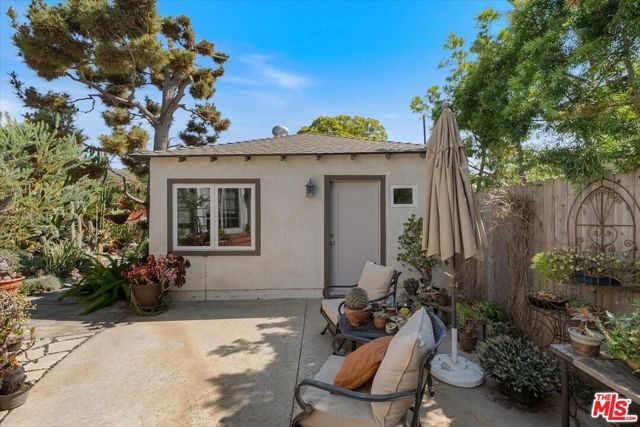 Rare beautiful fully furnished 1-bedroom, 1-bath Santa Monica ADU set within one of the most extraordinary private botanical gardens you'll find anywhere in West LA. This standalone California cottage offers the privacy and serenity of a secluded retreat while sitting just minutes from the beach, Main Street, and Montana Avenue's premier shops and dining. The open-concept living, dining, and kitchen area is bright and airy, anchored by wide-plank luxury vinyl flooring, recessed lighting, and oversized windows framing lush garden views on multiple sides. The living room is tastefully furnished with a gray tufted sofa, glass coffee table, wall-mounted flat screen TV, and a walnut media console. A dedicated workspace with desk and ergonomic chair makes this an ideal setup for remote professionals. The kitchen is fully equipped and beautifully appointed with floor-to-ceiling gray shaker cabinetry, quartz countertops, a marble-look backsplash, and a full suite of stainless steel appliances including a KitchenAid French door refrigerator, five-burner gas range, over-range microwave, and dishwasher. A round dining table with chairs sits adjacent to the kitchen for an easy everyday flow. The bedroom is comfortably sized with recessed lighting, LVP flooring, a mirrored sliding door closet, and a clerestory window for natural light and privacy. It opens directly to a private outdoor patio through a full-width sliding glass door a standout indoor-outdoor feature. The bath is spa-caliber, featuring floor-to-ceiling marble-look tile, a frameless glass-enclosed shower, white shaker vanity, quartz countertop, and brushed nickel fixtures throughout. The unit is equipped with a ductless mini-split HVAC system for year-round comfort, a smart home panel, and central HVAC. Fully furnished and move-in ready. The surrounding grounds are nothing short of remarkable! A mature, curated drought-tolerant botanical garden featuring rare cacti, towering aloes, succulents, paver pathways, and specimen trees cultivated over decades. Multiple outdoor seating areas on the private patio and throughout the garden create a sanctuary feel rarely found in any urban rental.