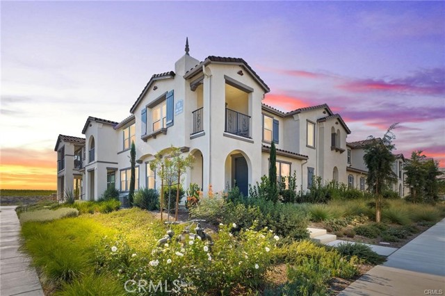 Experience refined living at Belmont at Sunset Ranch, a thoughtfully designed enclave in the vibrant community of Ontario Ranch. This sophisticated 3-bedroom, 2.5-bath residence blends modern design with effortless comfort, offering a polished yet highly livable space. Positioned as a premium end unit with ideal southern exposure, the home is filled with natural light throughout the day. A private 2-car garage is complemented by convenient guest parking nearby, creating both ease and flexibility. Upon entry, soaring 9-foot ceilings and an open-concept layout set the tone for a bright, expansive interior. The main level is curated for both everyday living and entertaining, where the living, dining, and kitchen spaces flow seamlessly together. The kitchen serves as a centerpiece, appointed with cloud-toned shaker cabinetry, a generous island, walk-in pantry, and quartz surfaces. A suite of Whirlpool stainless steel appliances—including a slide-in gas range—adds both function and sophistication, while luxury vinyl plank flooring enhances the clean, contemporary aesthetic. Upstairs, a versatile loft offers a secondary lounge or workspace, separating the private quarters. Two well-proportioned secondary bedrooms share a beautifully appointed bath featuring dual vanities and a full tub/shower combination. The primary suite is designed as a tranquil retreat, complete with a spacious walk-in closet and a spa-inspired bath with dual sinks, cultured marble finishes, and a walk-in shower. A private balcony extends the suite outdoors, offering a serene vantage point overlooking the community pool. Designed with efficiency and sustainability in mind, the home includes a tankless water heater, smart thermostat, dual-pane Low-E windows, and an integrated solar energy system—delivering comfort and long-term savings. Residents of Belmont enjoy access to resort-style amenities, including landscaped parks, a pool and spa, dog park, and pickleball courts. Ideally located near the I-15, I-10, and 60 freeways, the community offers access to shopping, dining, and entertainment, including Costco, 99 Ranch Market, Eastvale Gateway, and Ontario Mills. Ontario International Airport is just minutes away, and Park View Elementary School is nearby.